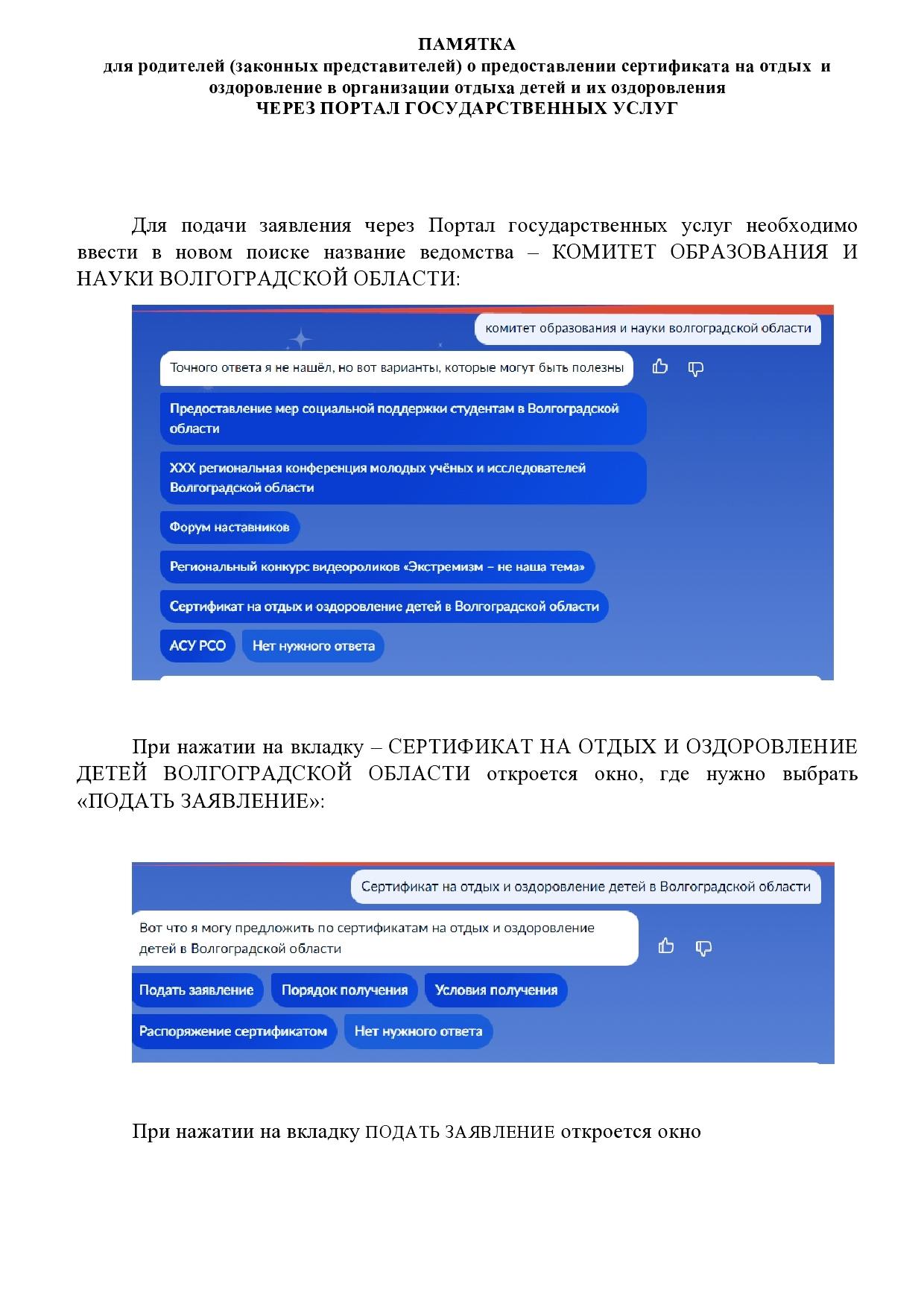 ПАМЯТКА для родителей о предоставлении сертификата на отдых и оздоровление детей ЧЕРЕЗ ПОРТАЛ ГОСУДАРСТВЕННЫХ УСЛУГ