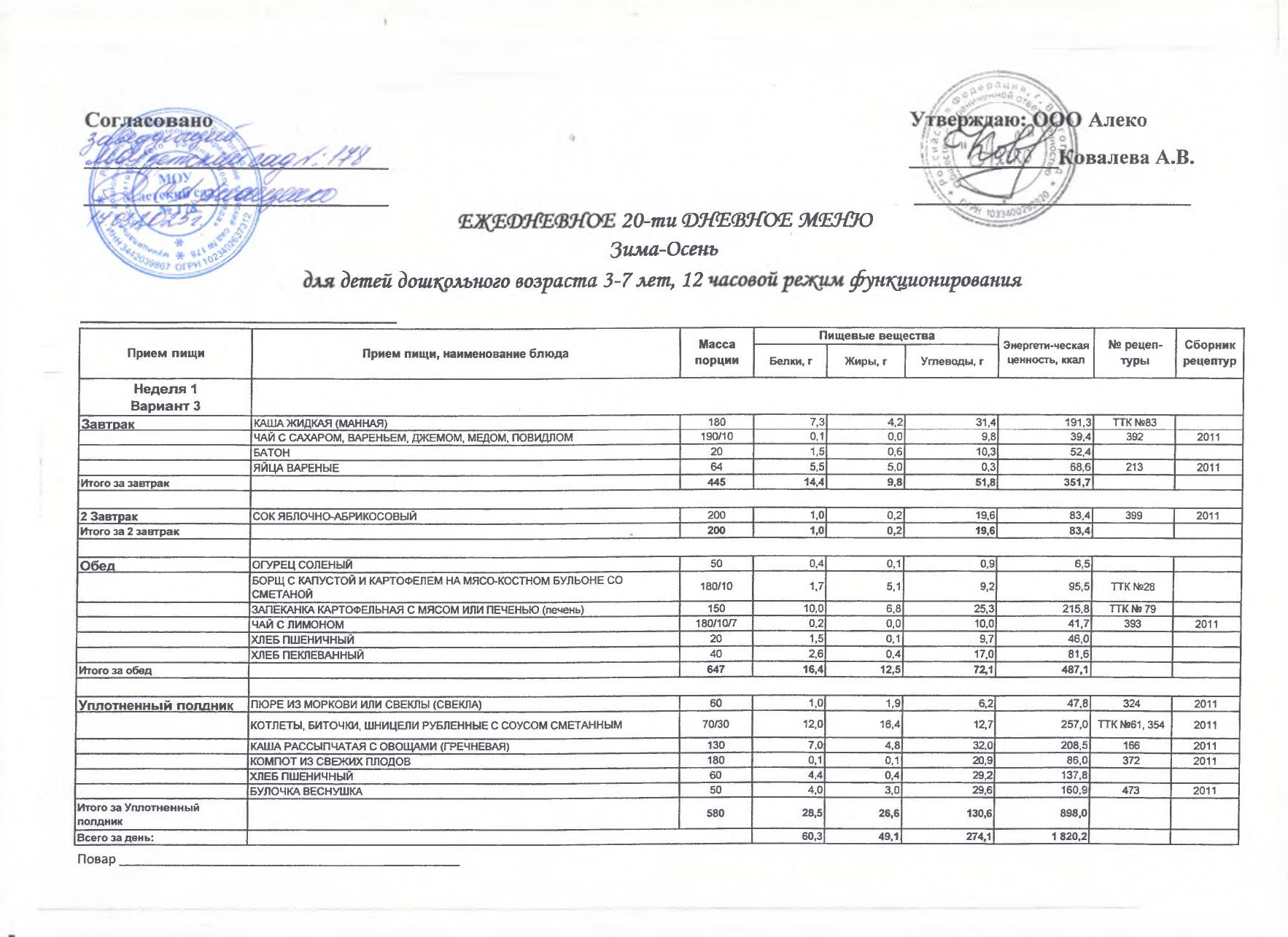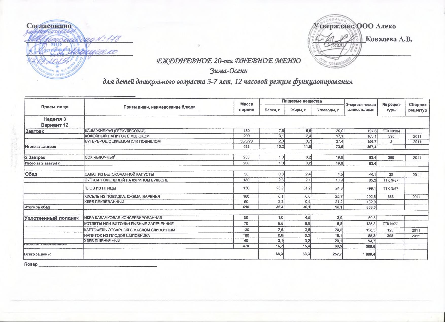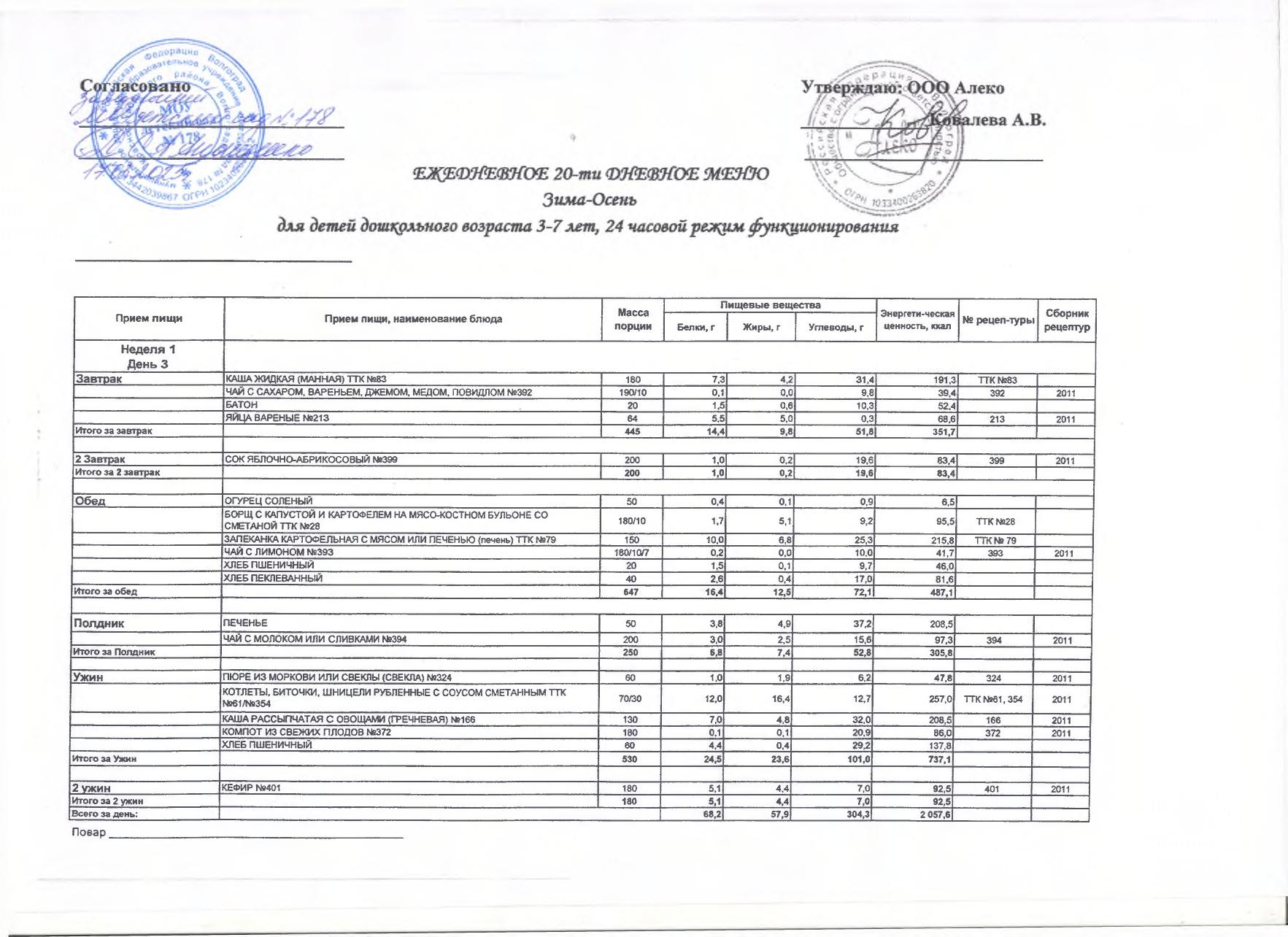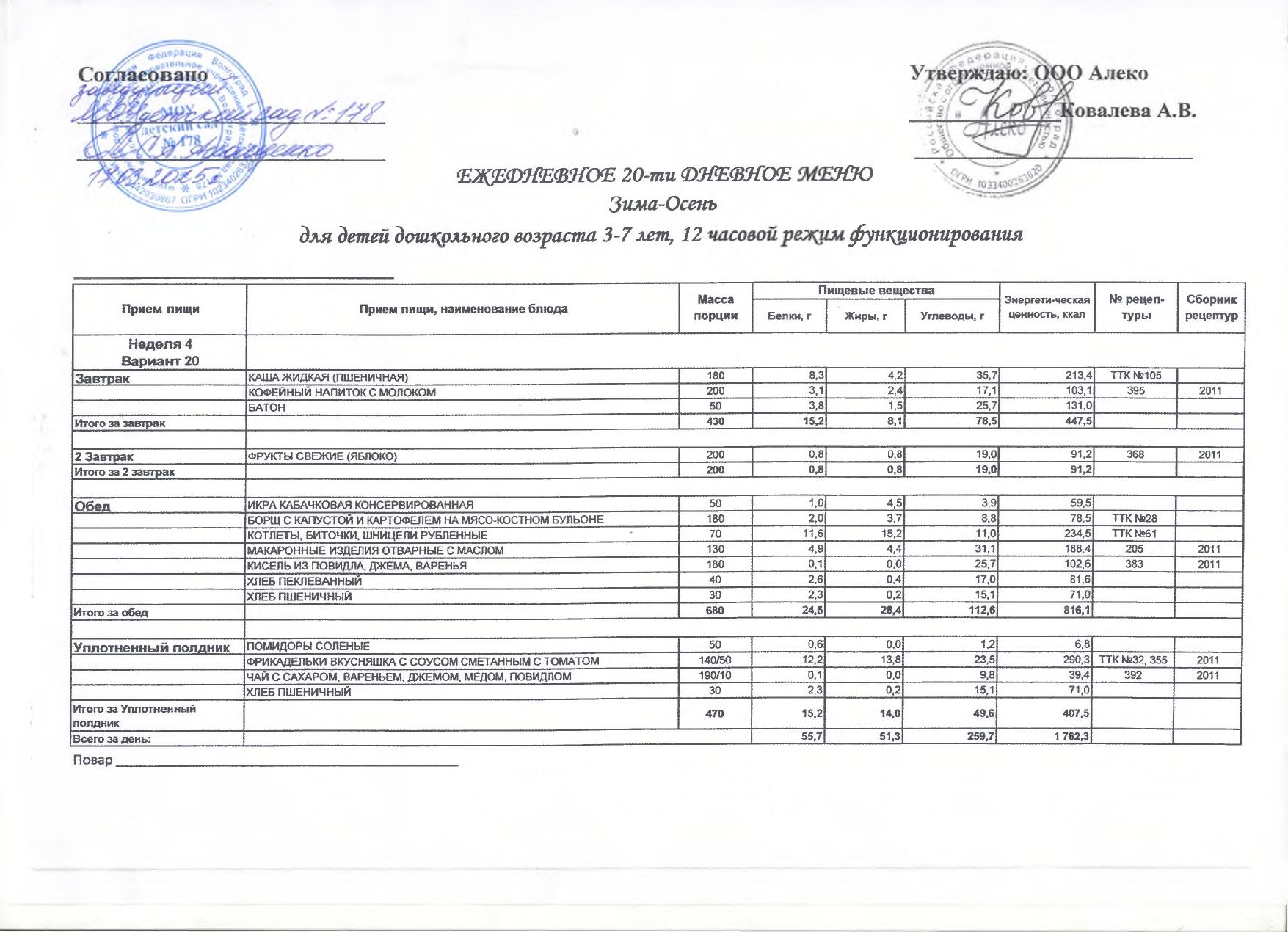 С 13.10.2025 года действует ежедневное 20-ти дневное меню Зима-Осень для детей 3-7 лет дошкольного возраста с 12-ти часовым режимом функционирования