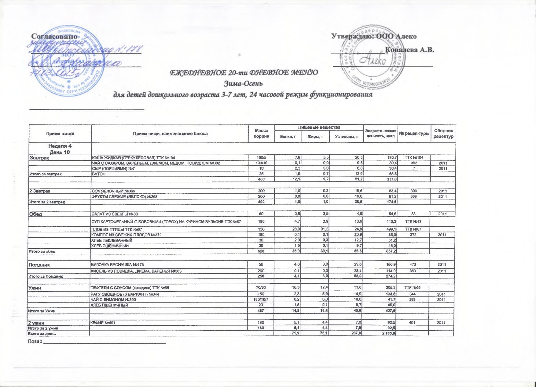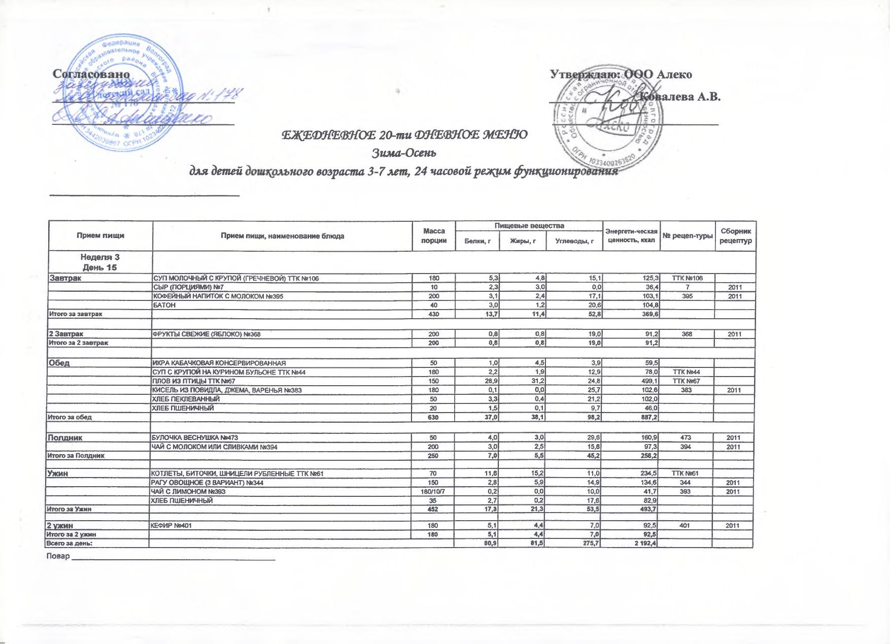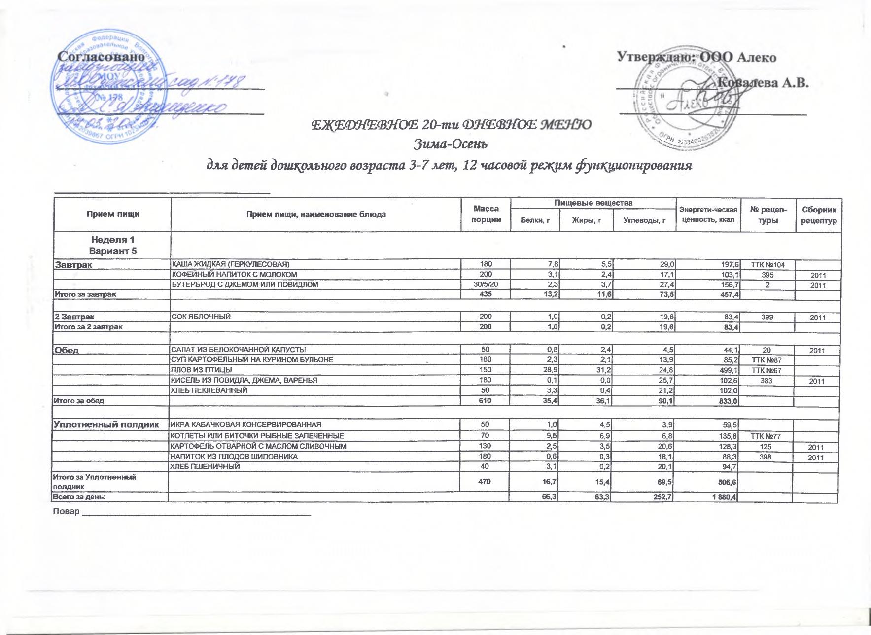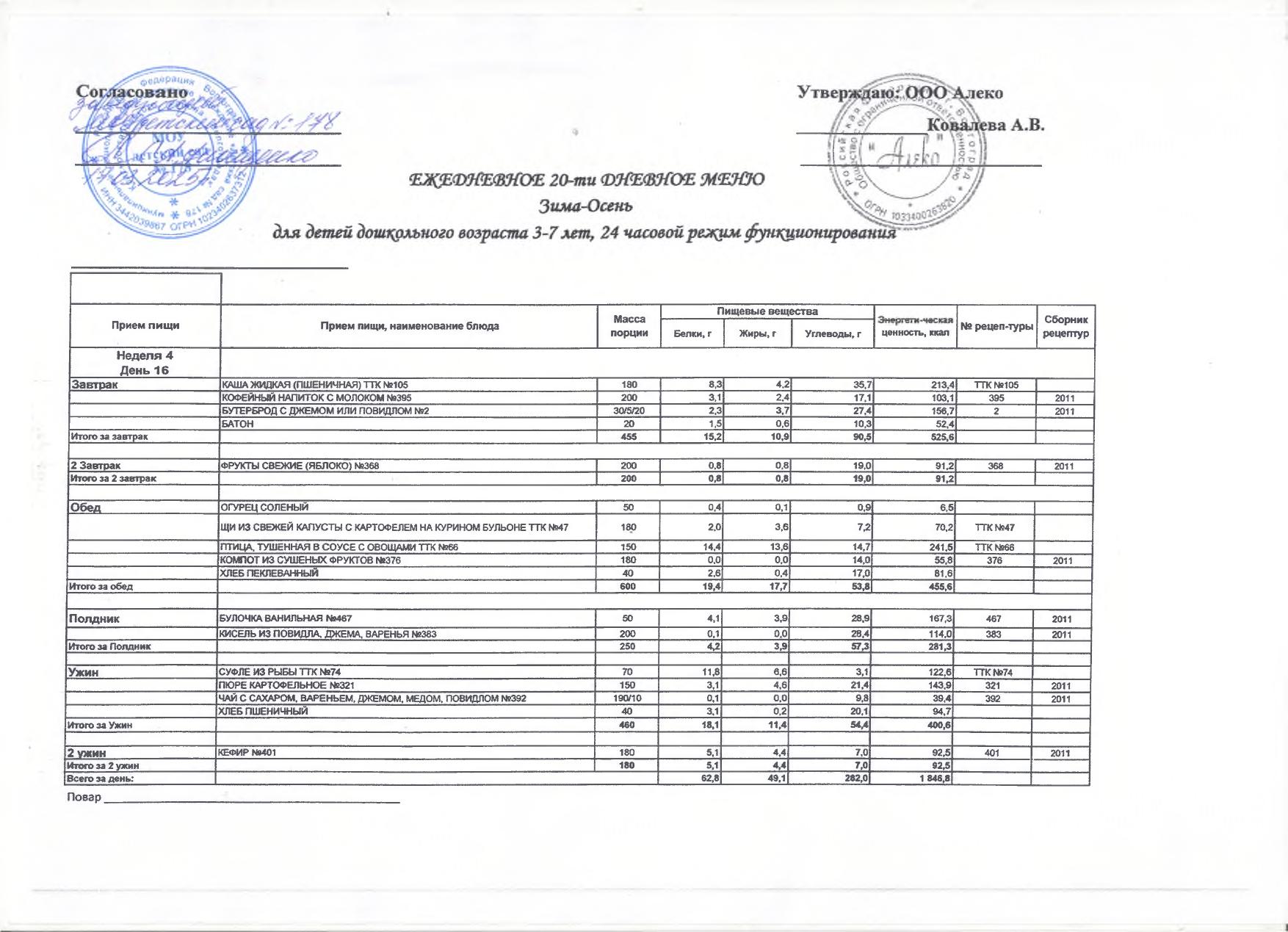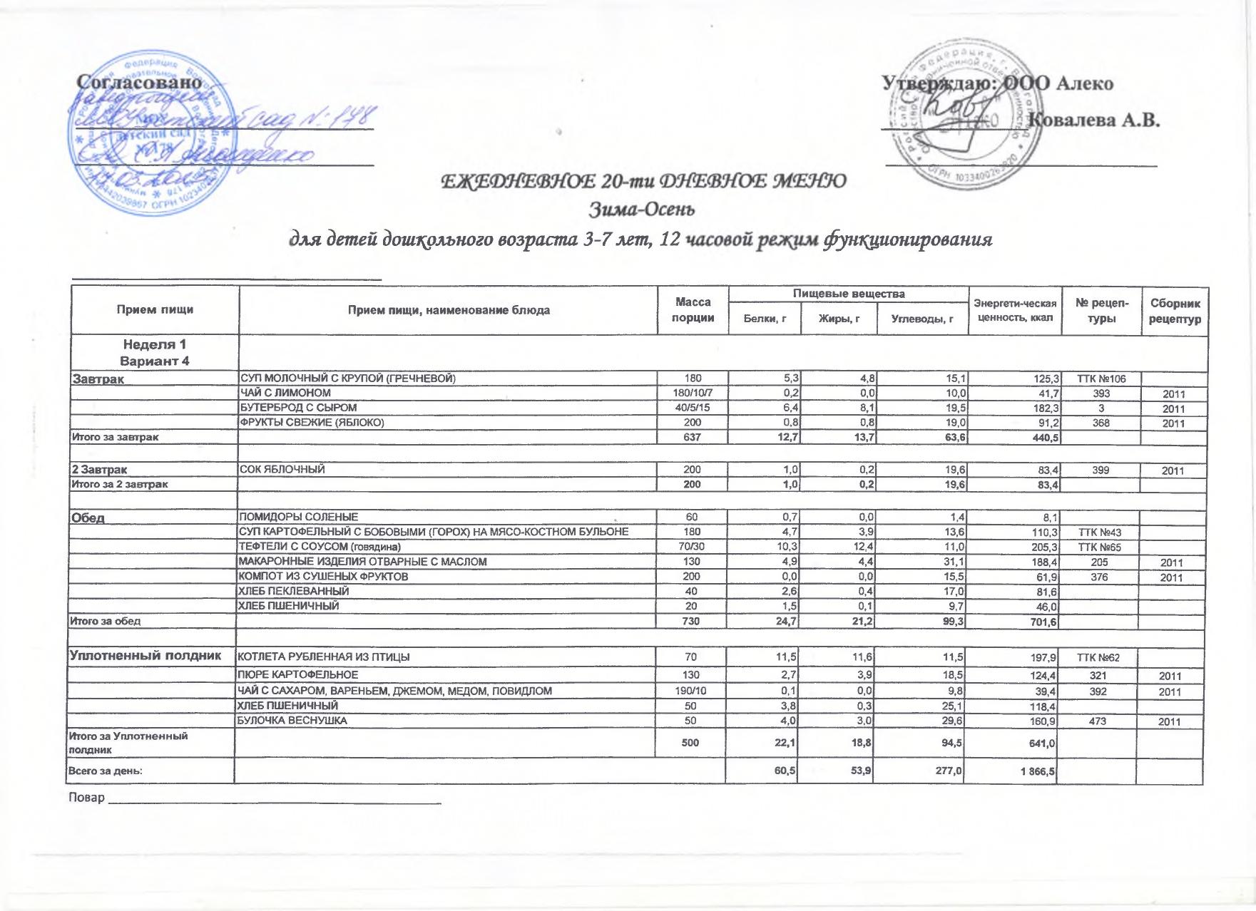 С 13.10.2025 года действует ежедневное 20-ти дневное меню Зима-Осень для детей 3-7 лет дошкольного возраста с 12-ти часовым режимом функционирования