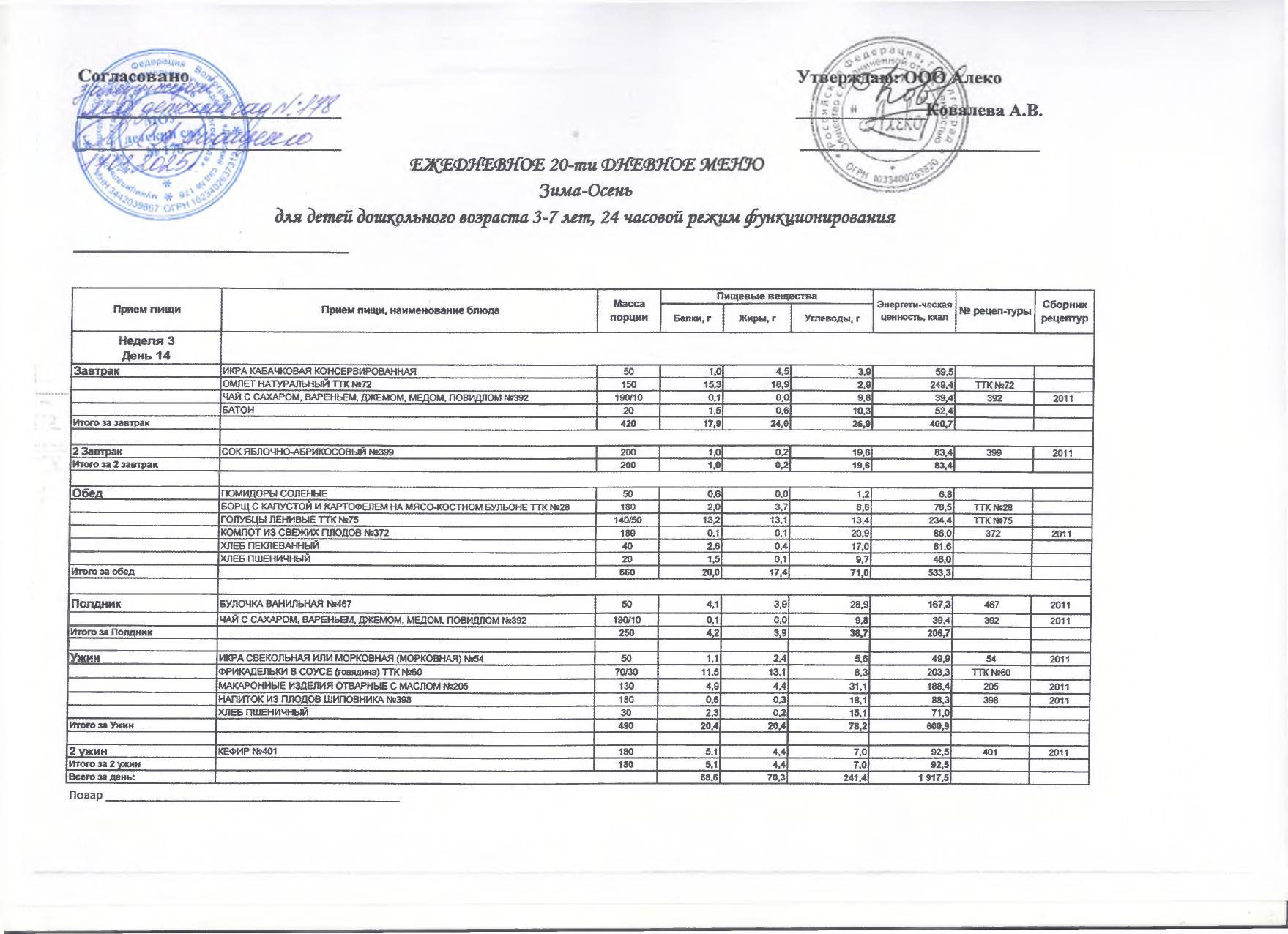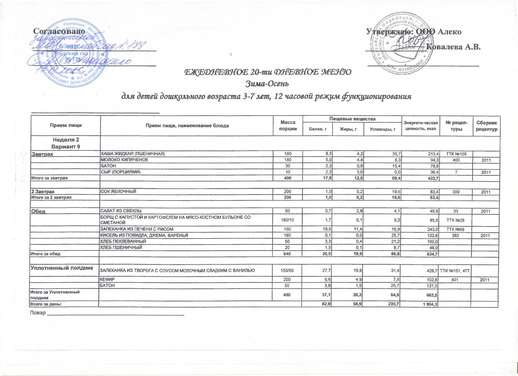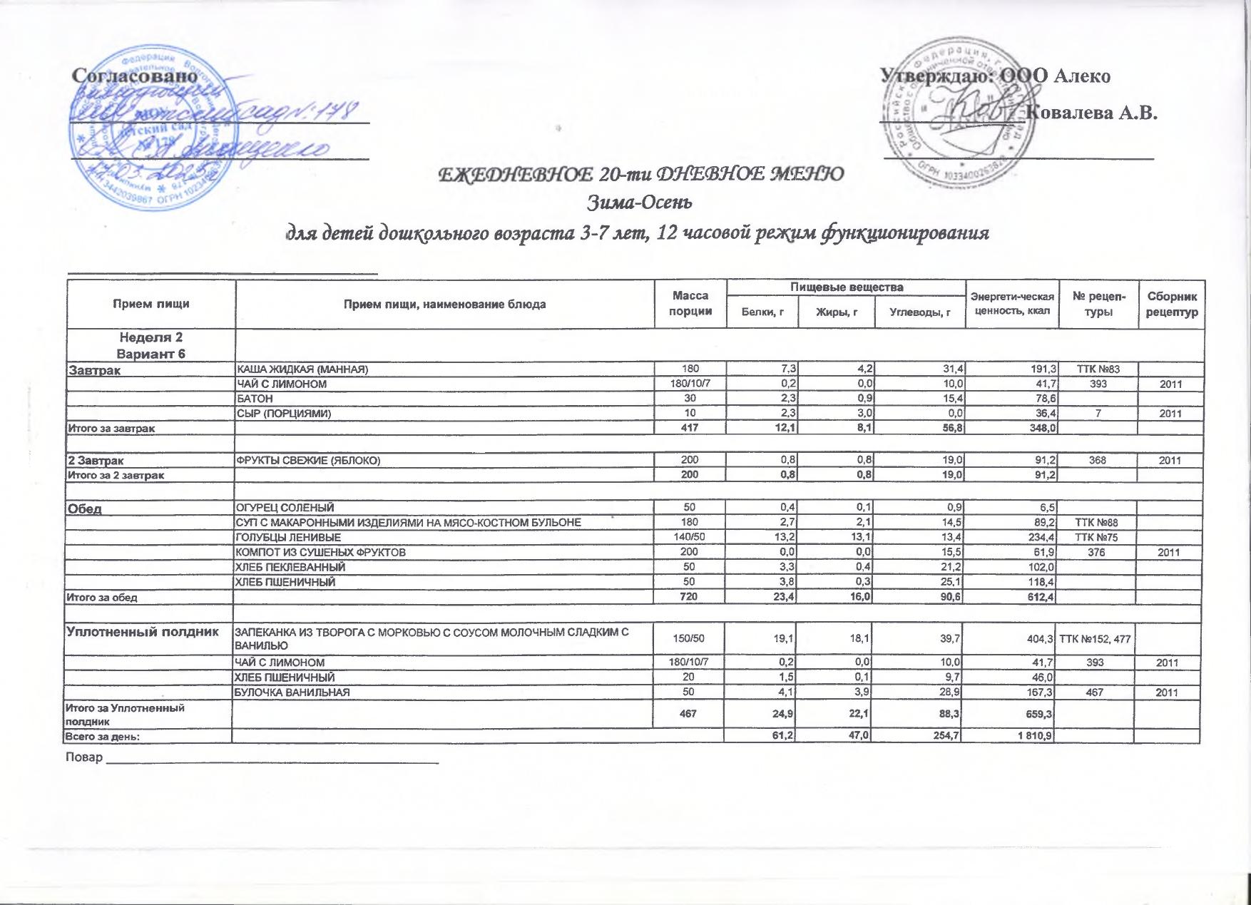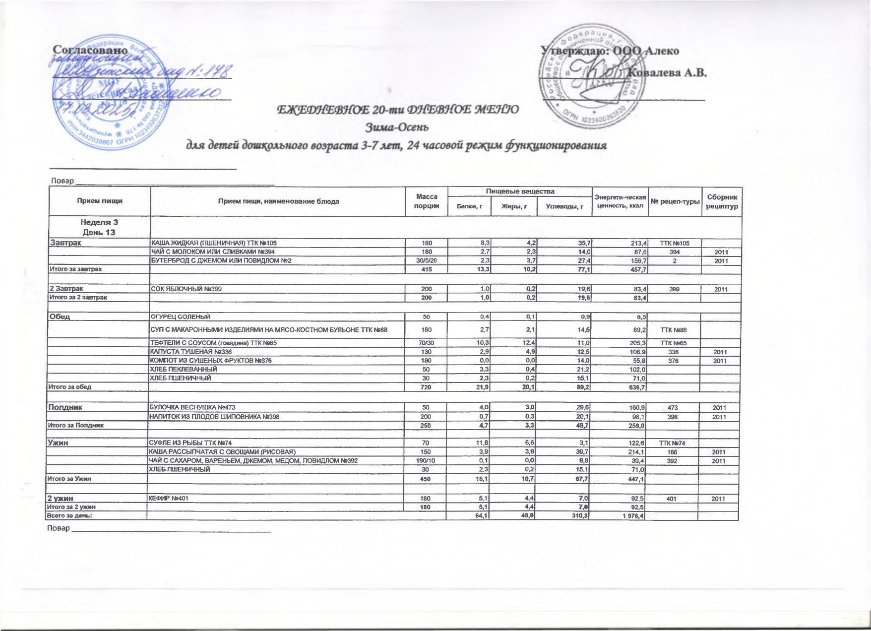 С 13.10.2025 года действует ежедневное 20-ти дневное меню Зима-Осень для детей 3-7 лет дошкольного возраста с 12-ти часовым режимом функционирования