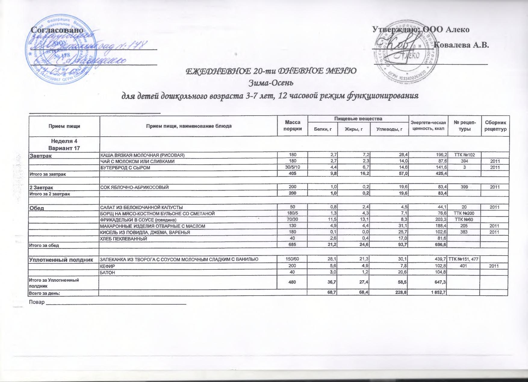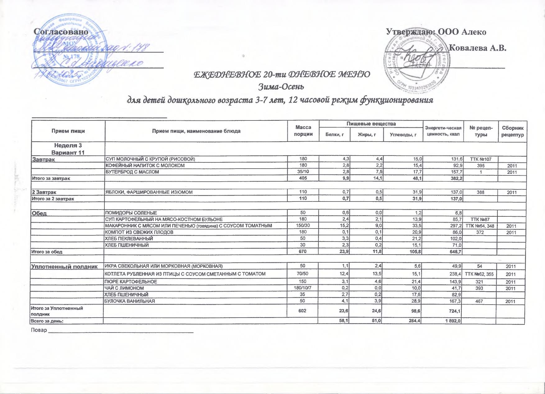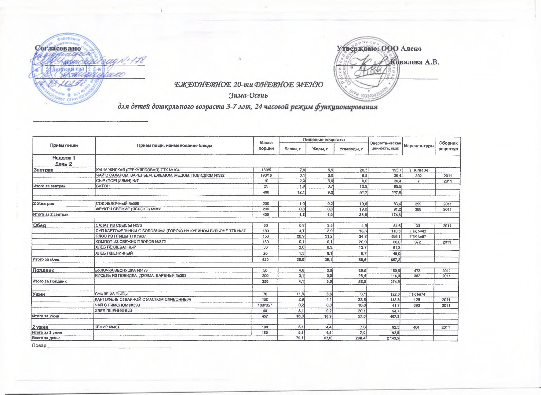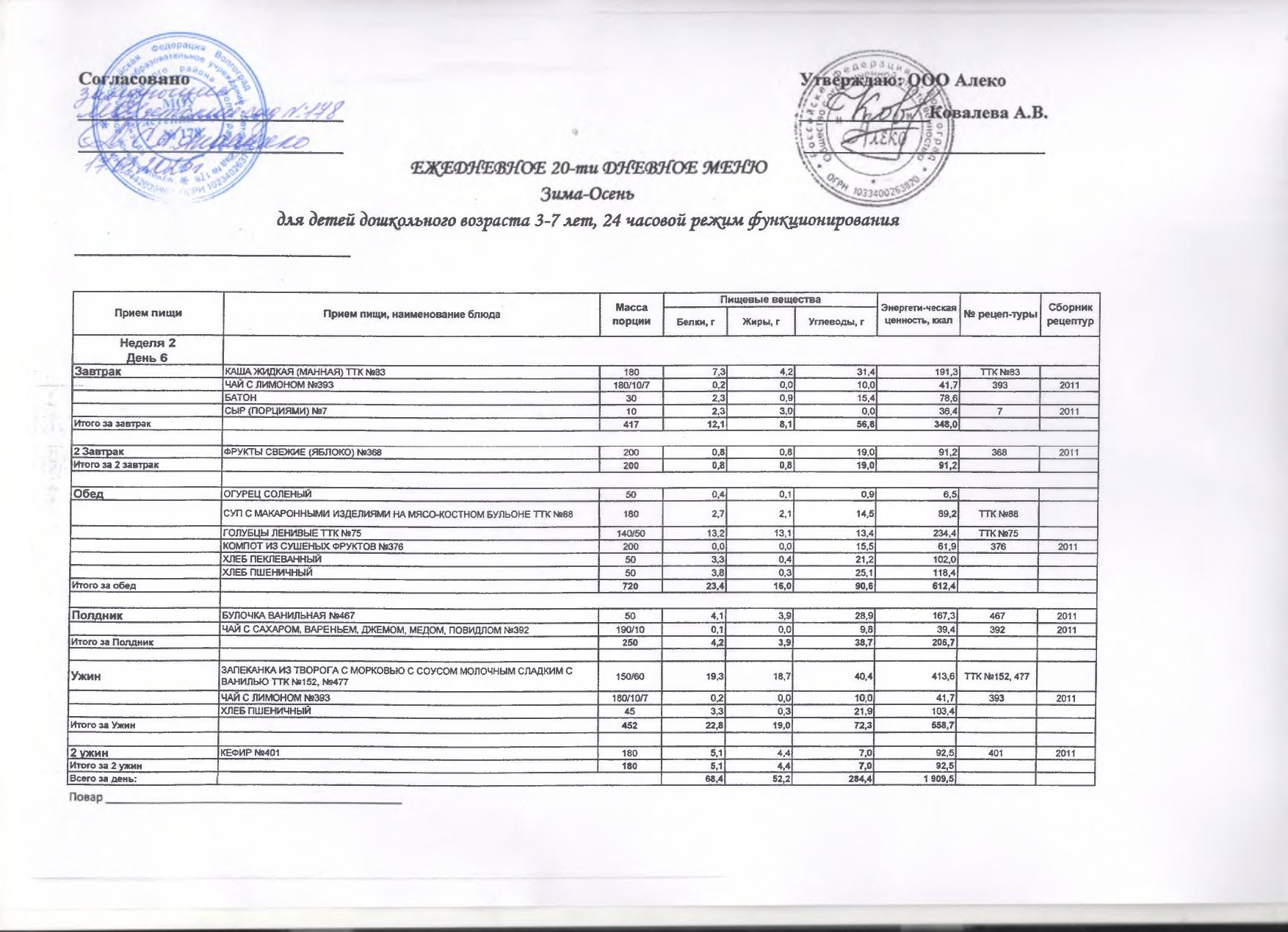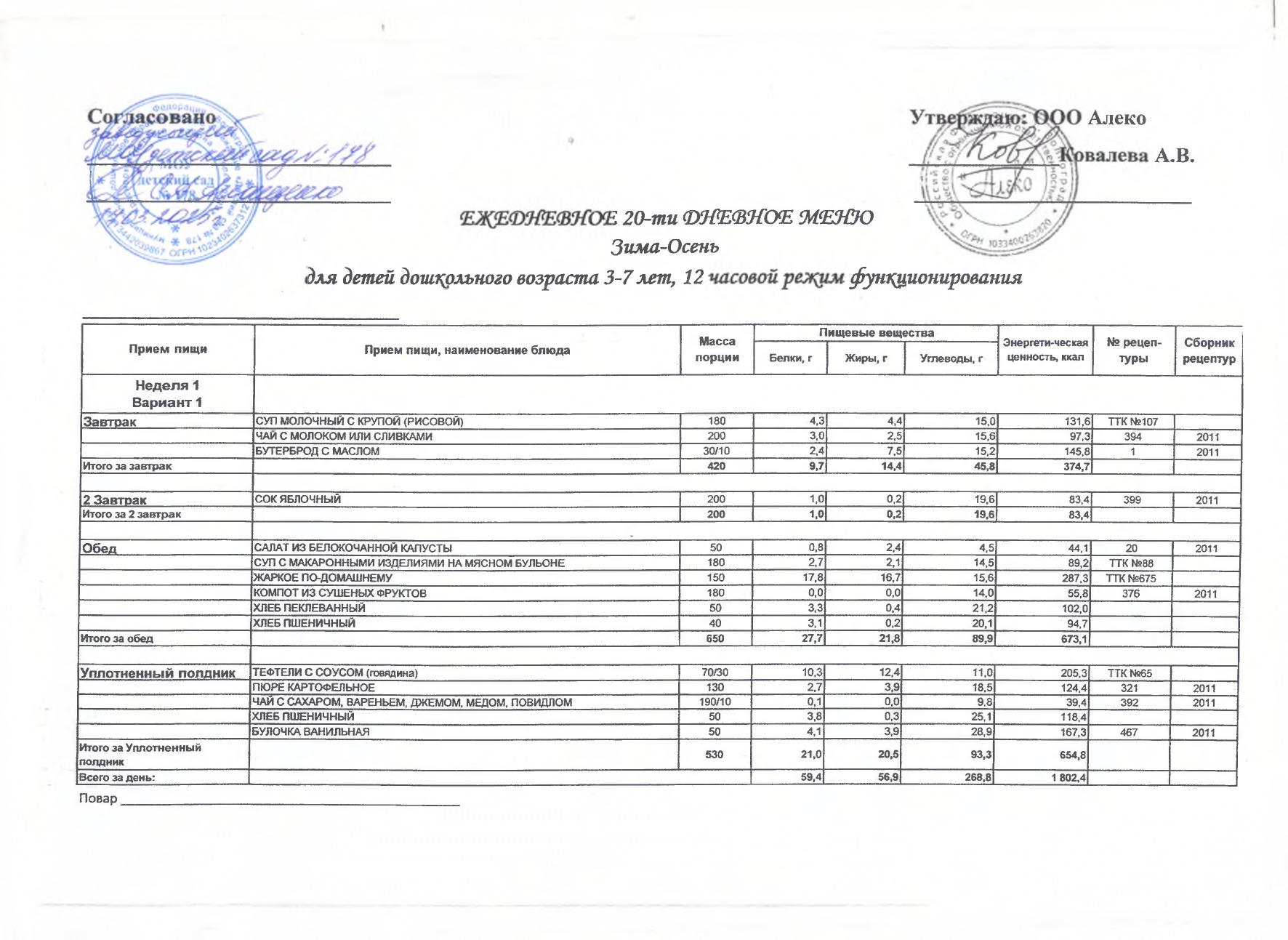 С 13.10.2025 года действует ежедневное 20-ти дневное меню Зима-Осень для детей 3-7 лет дошкольного возраста с 12-ти часовым режимом функционирования