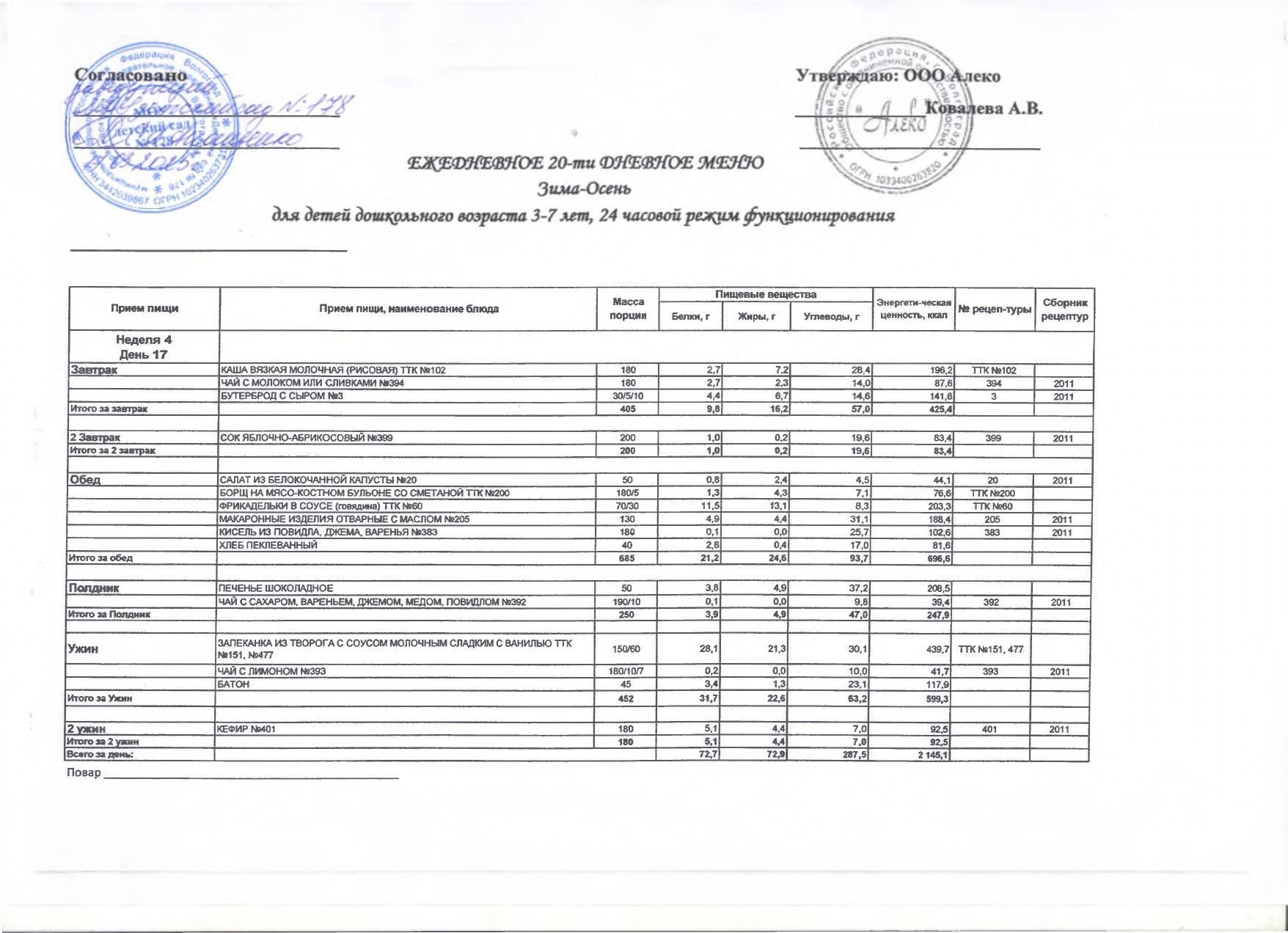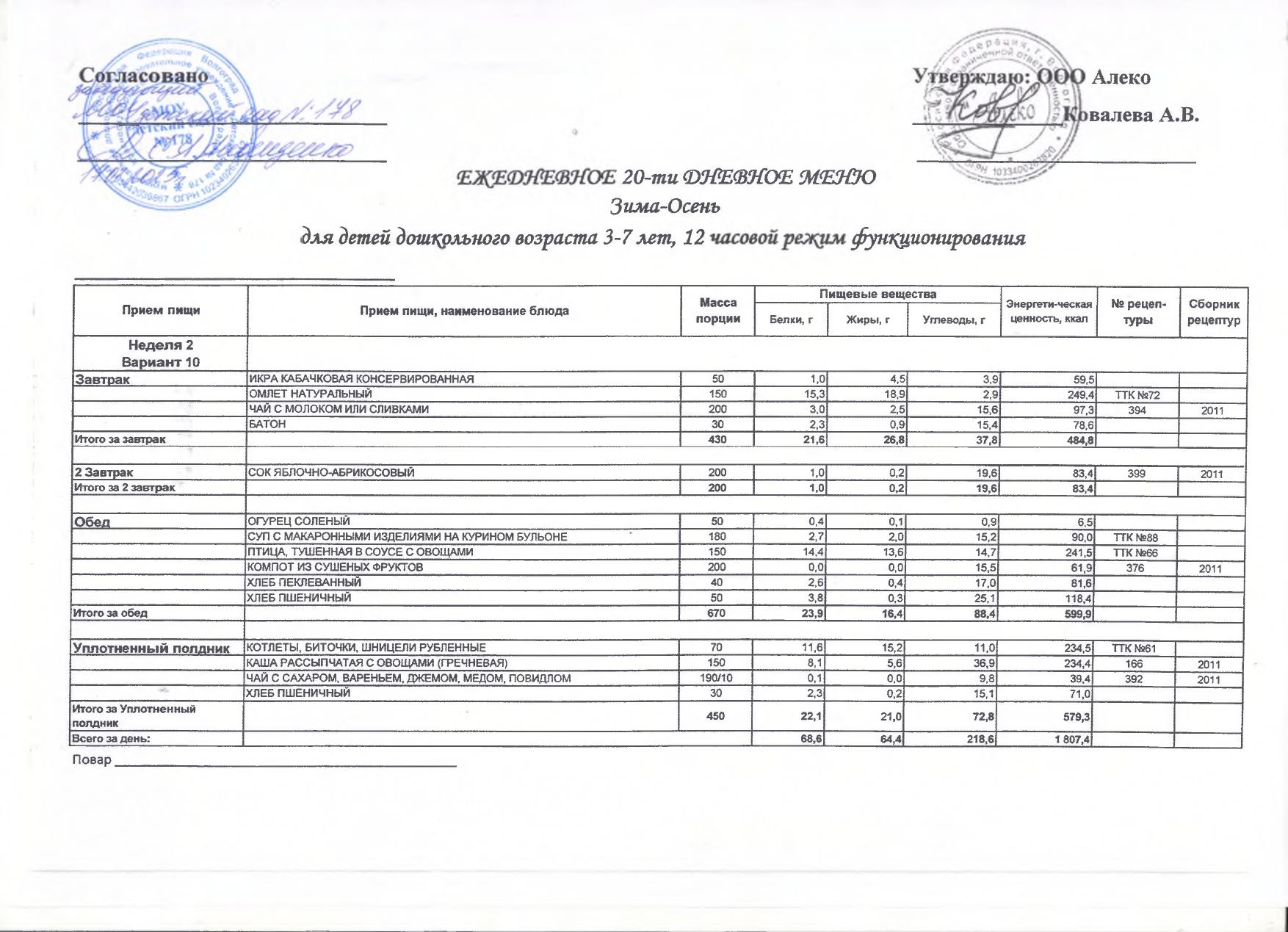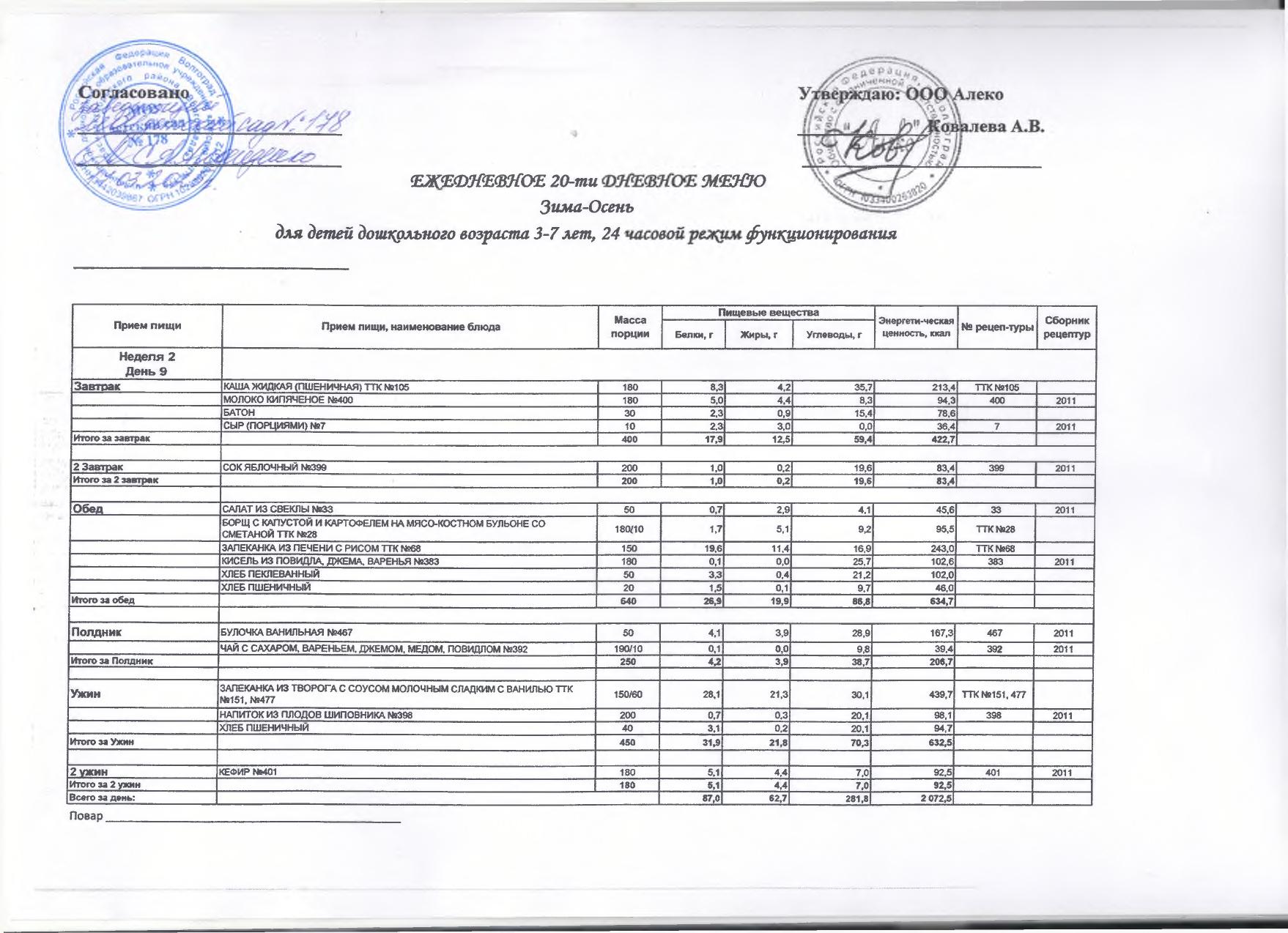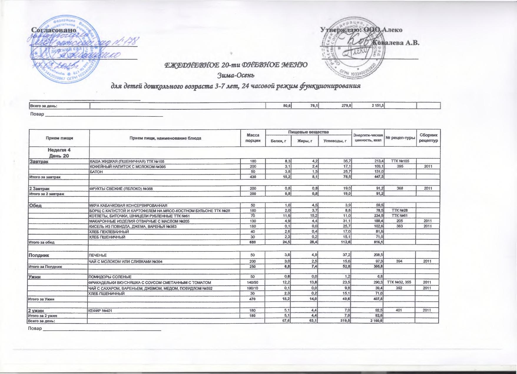 С 13.10.2025 года действует ежедневное 20-ти дневное меню Зима-Осень для детей 3-7 лет дошкольного возраста с 12-ти часовым режимом функционирования