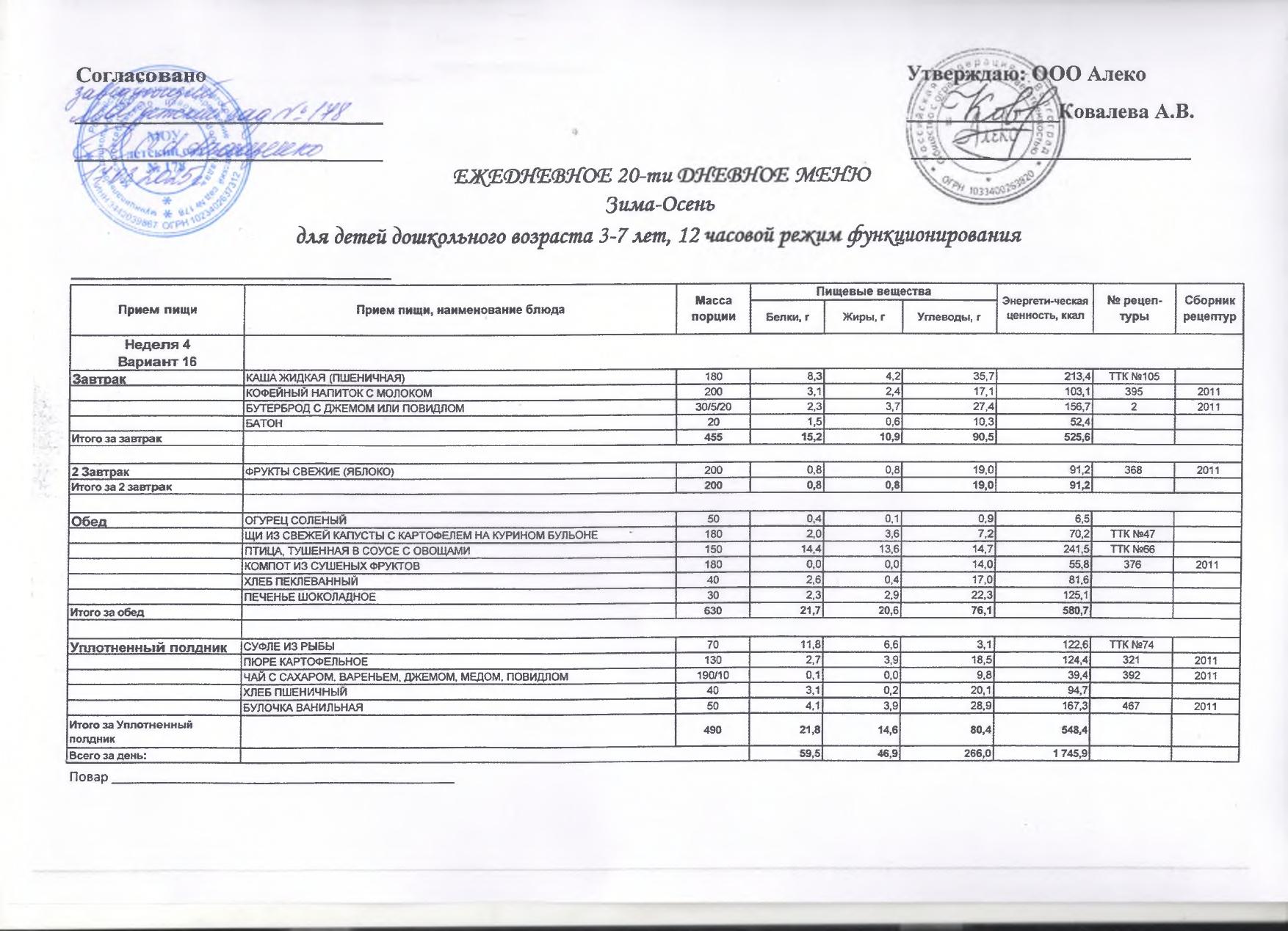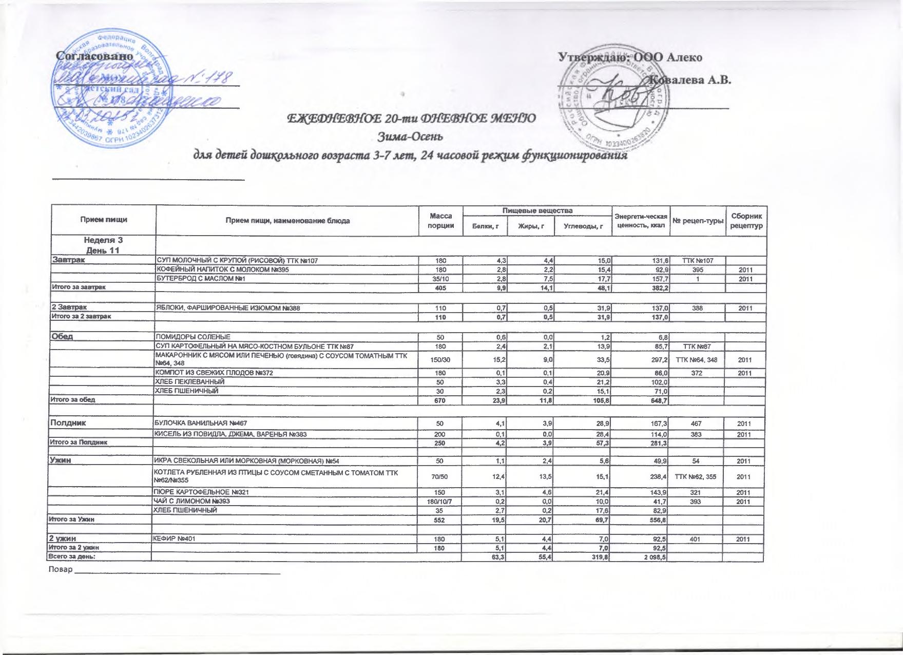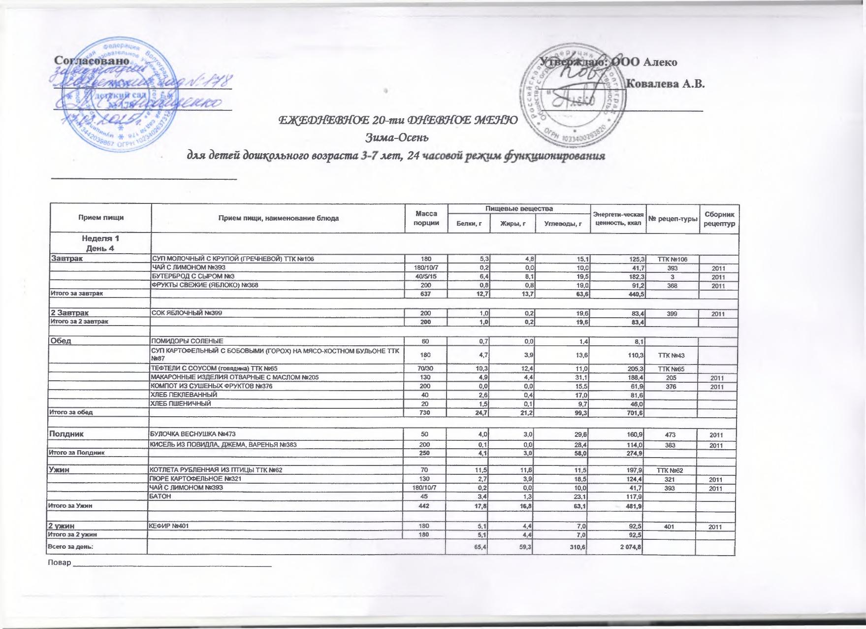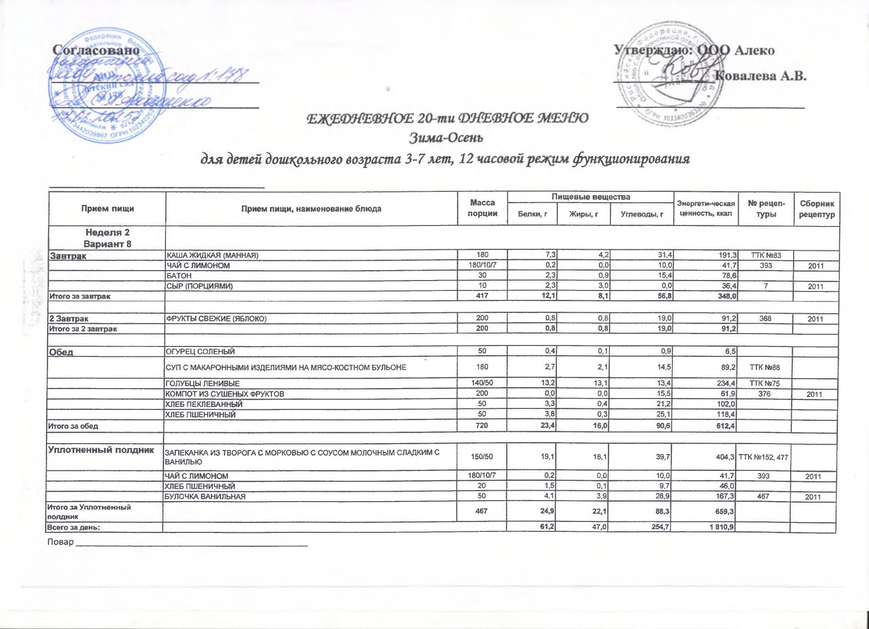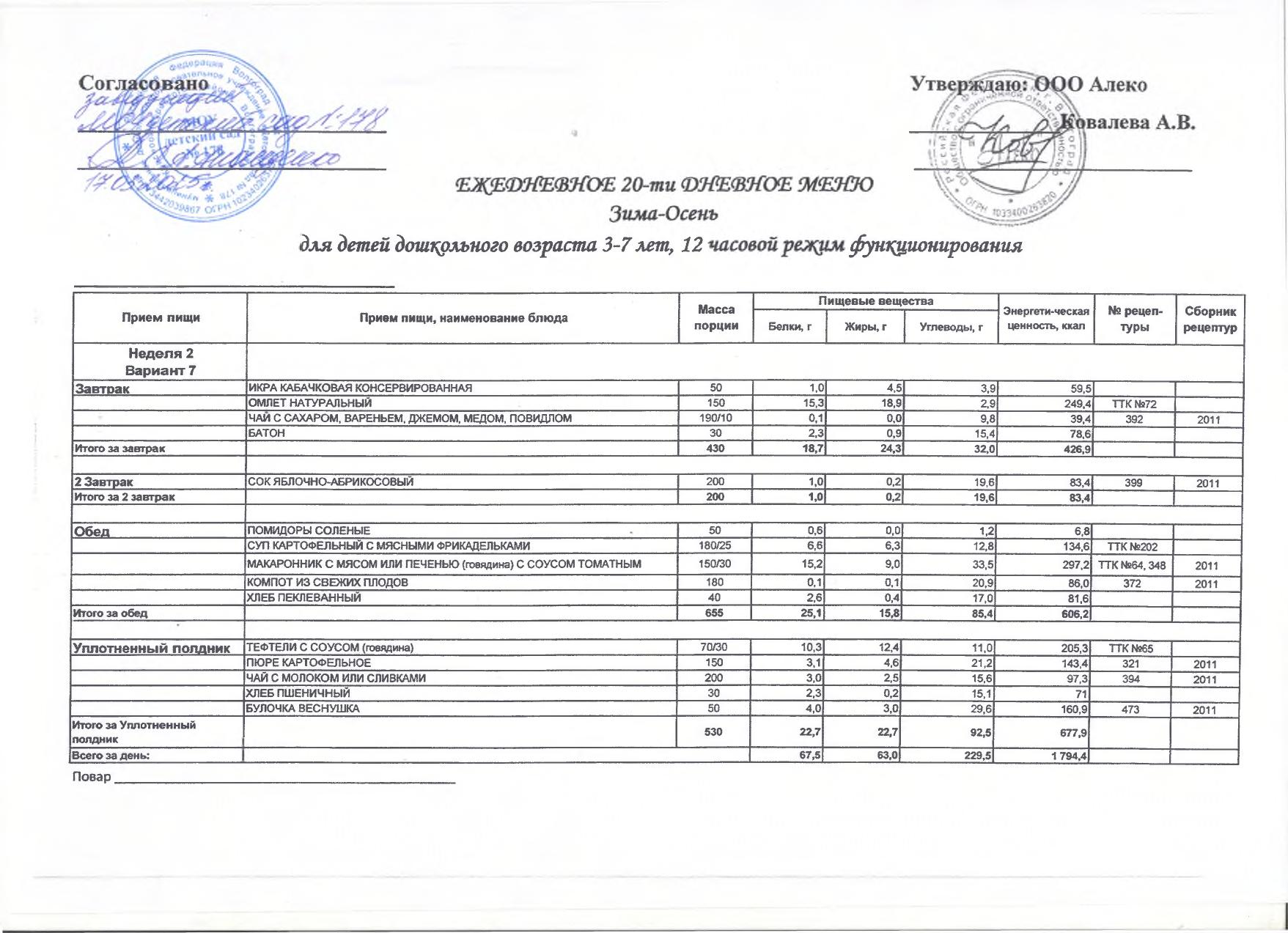 С 13.10.2025 года действует ежедневное 20-ти дневное меню Зима-Осень для детей 3-7 лет дошкольного возраста с 12-ти часовым режимом функционирования