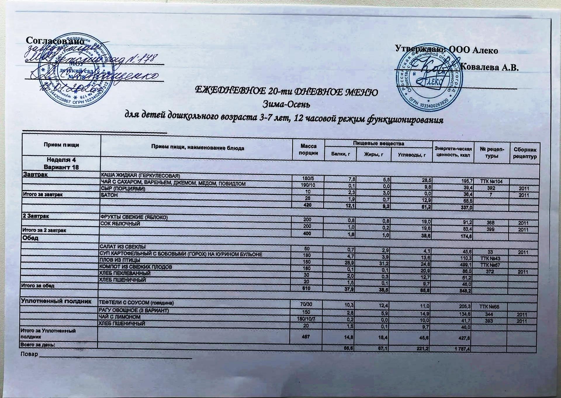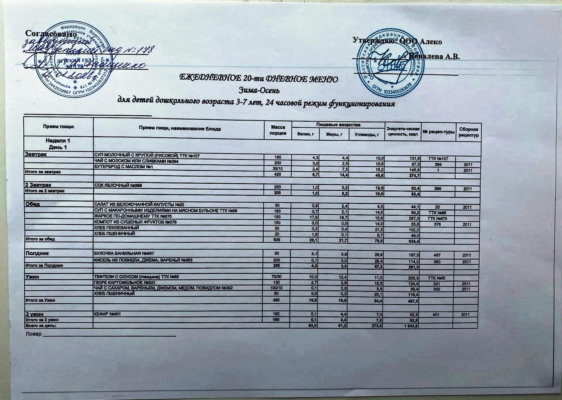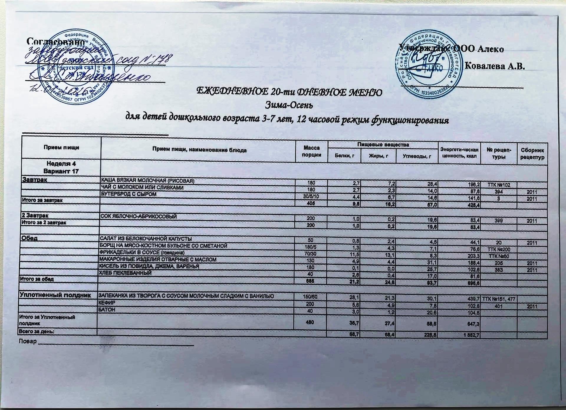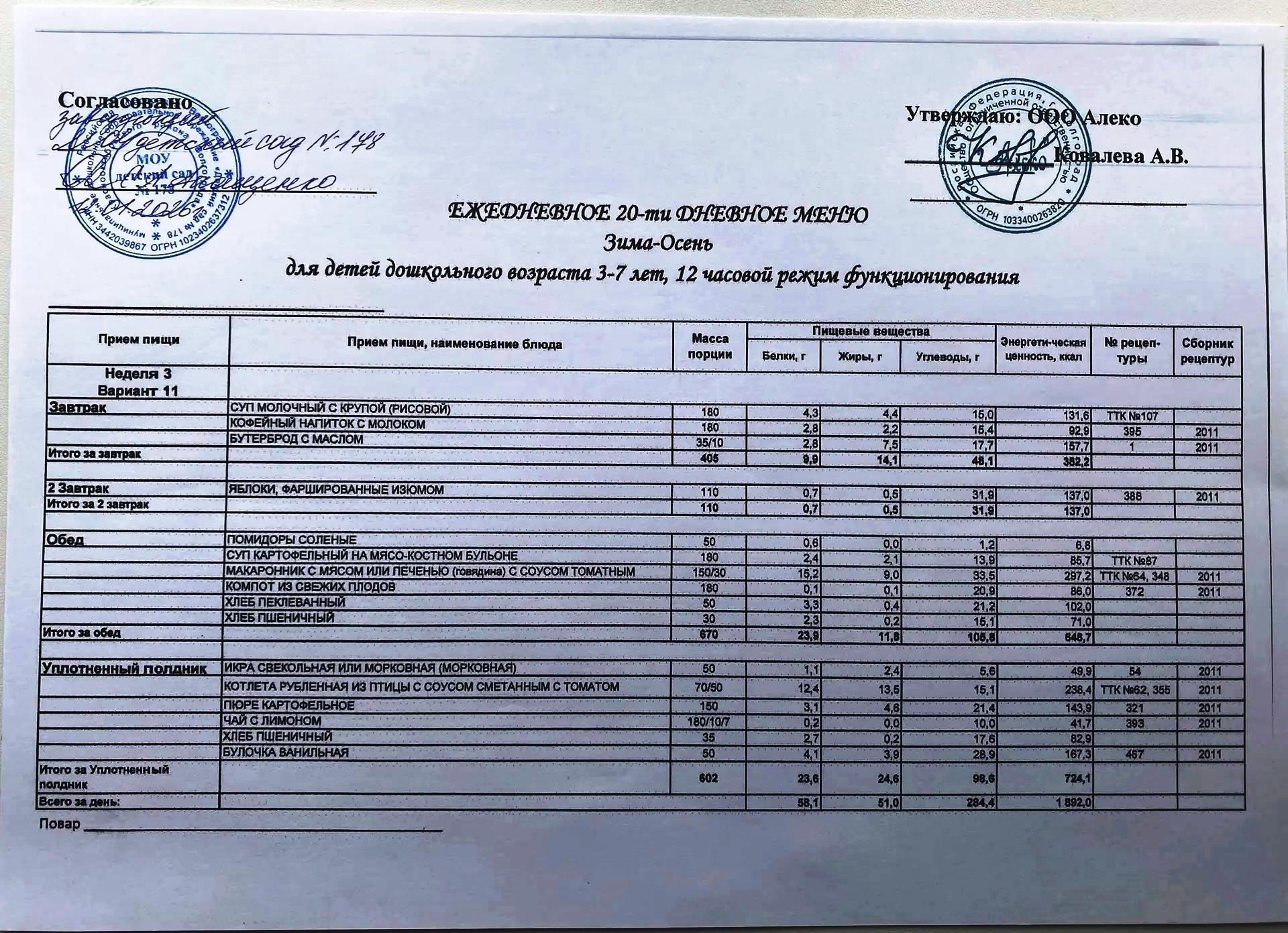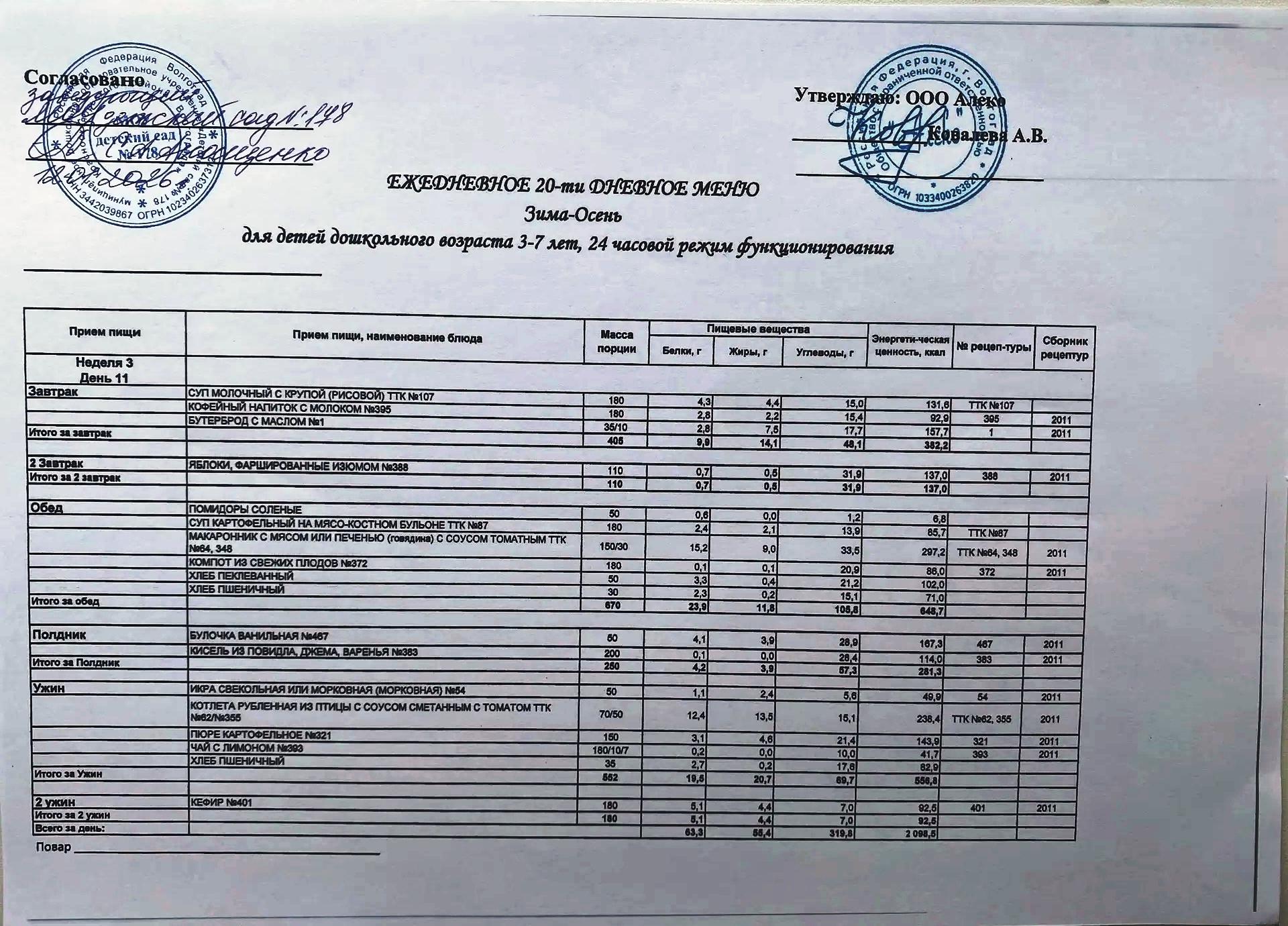 С 12.01.2026 года действует ежедневное 20-ти дневное меню Зима-Осень для детей 3-7 лет дошкольного возраста с 12-ти часовым режимом функционирования