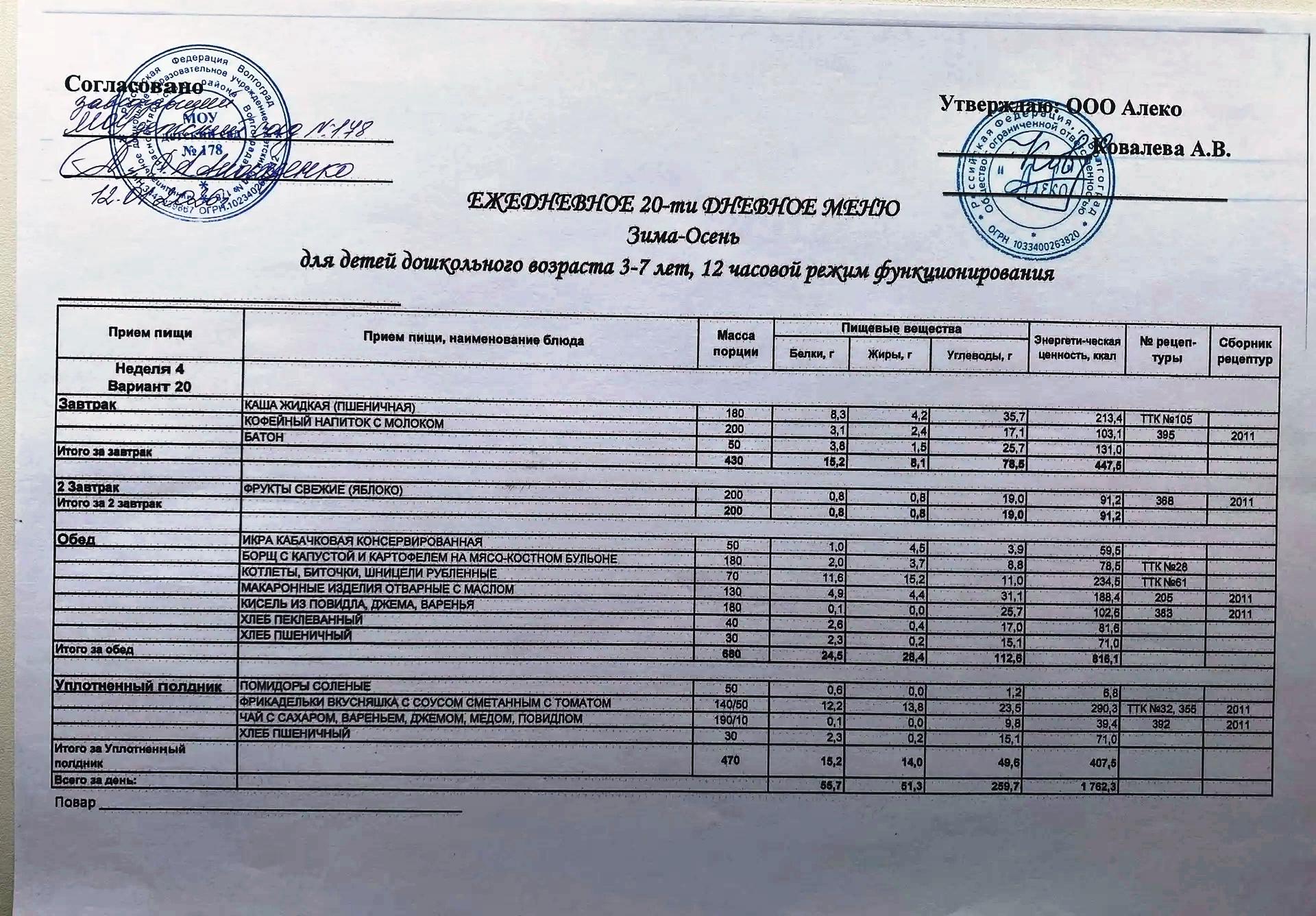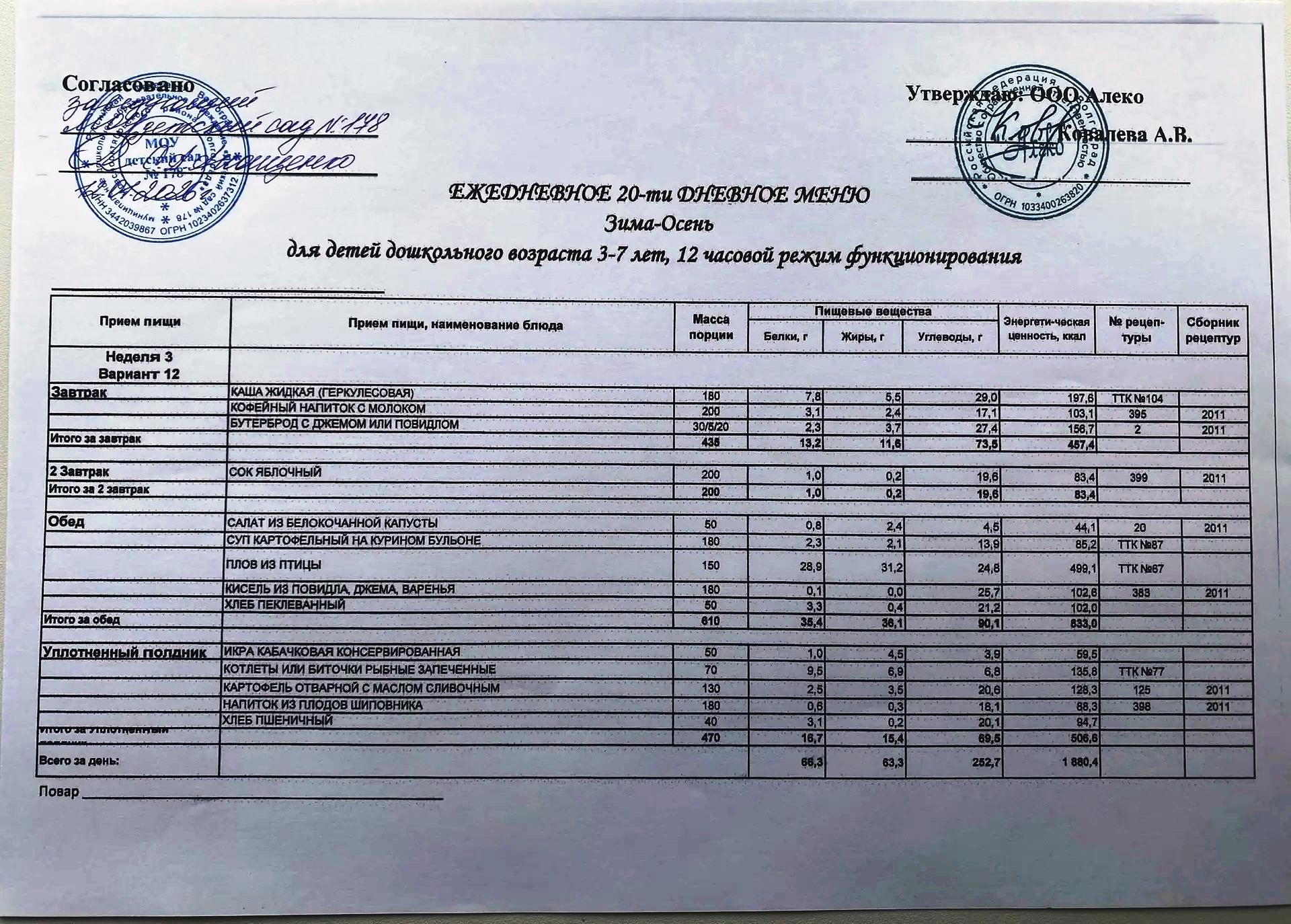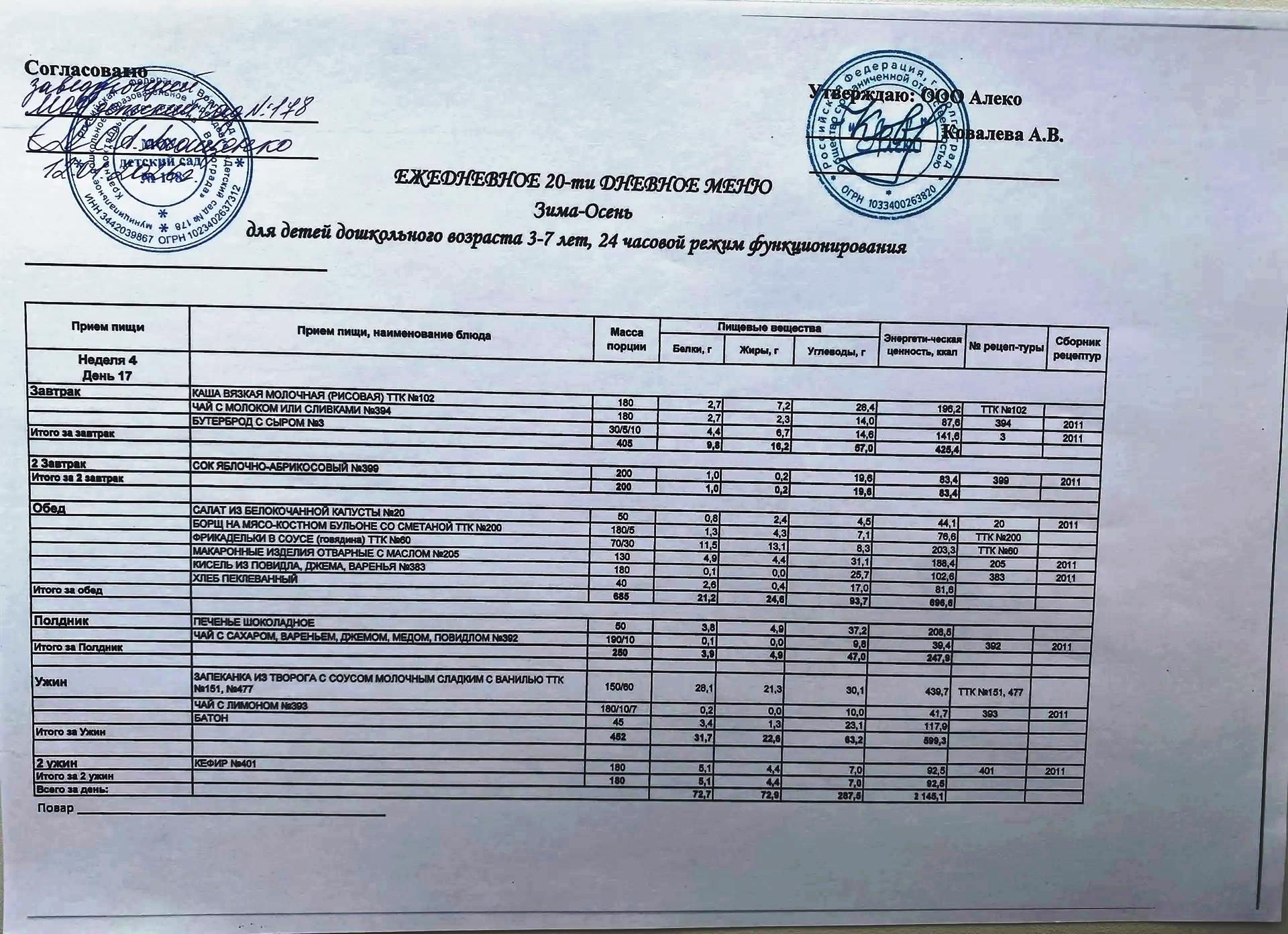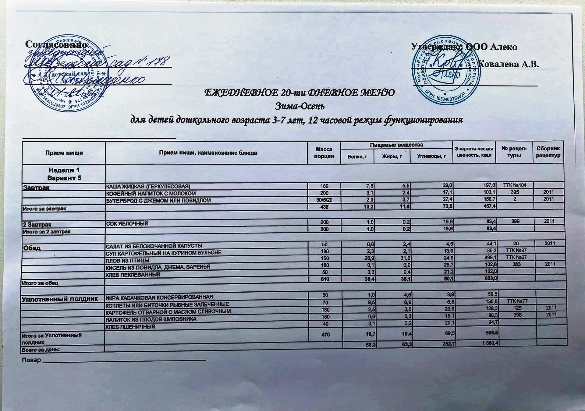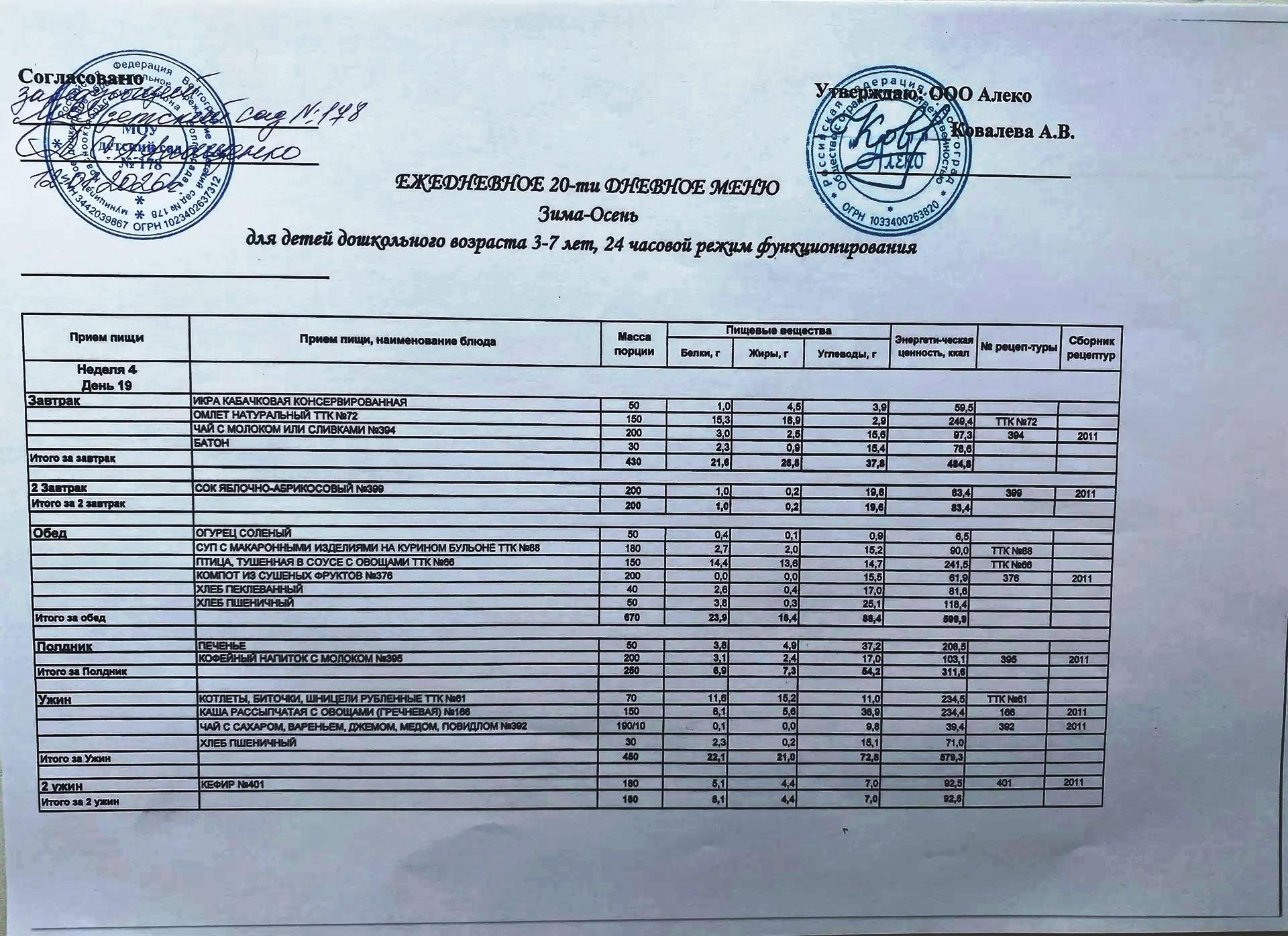 С 12.01.2026 года действует ежедневное 20-ти дневное меню Зима-Осень для детей 3-7 лет дошкольного возраста с 12-ти часовым режимом функционирования