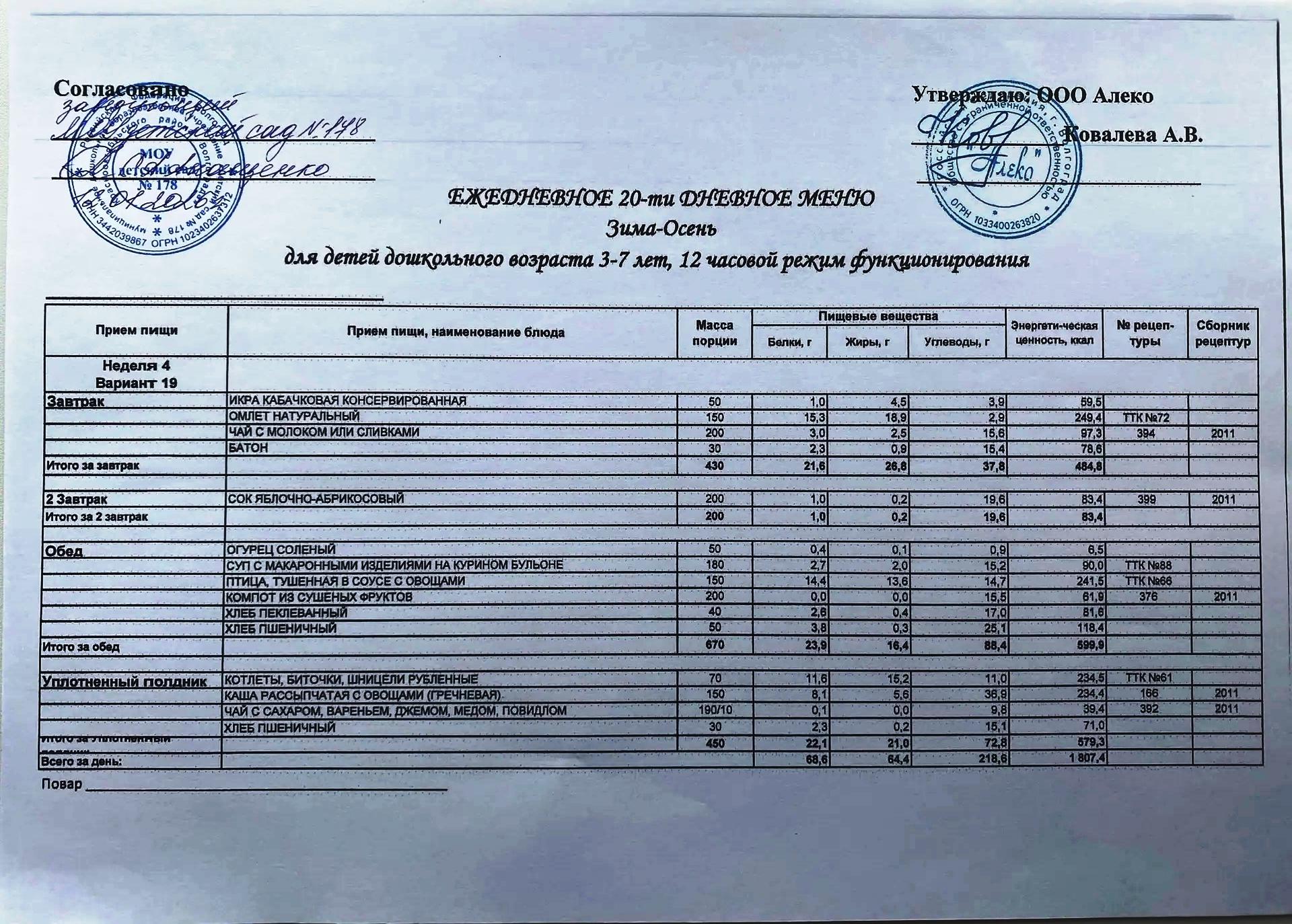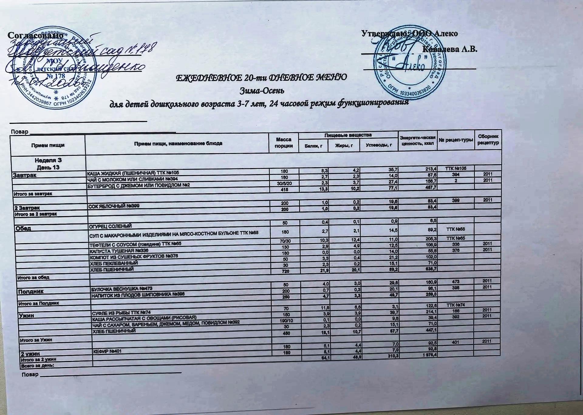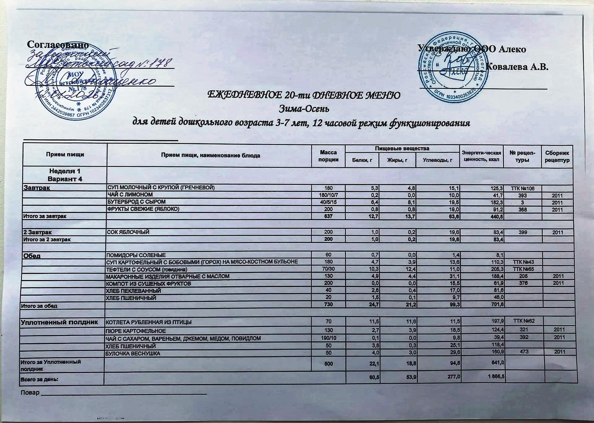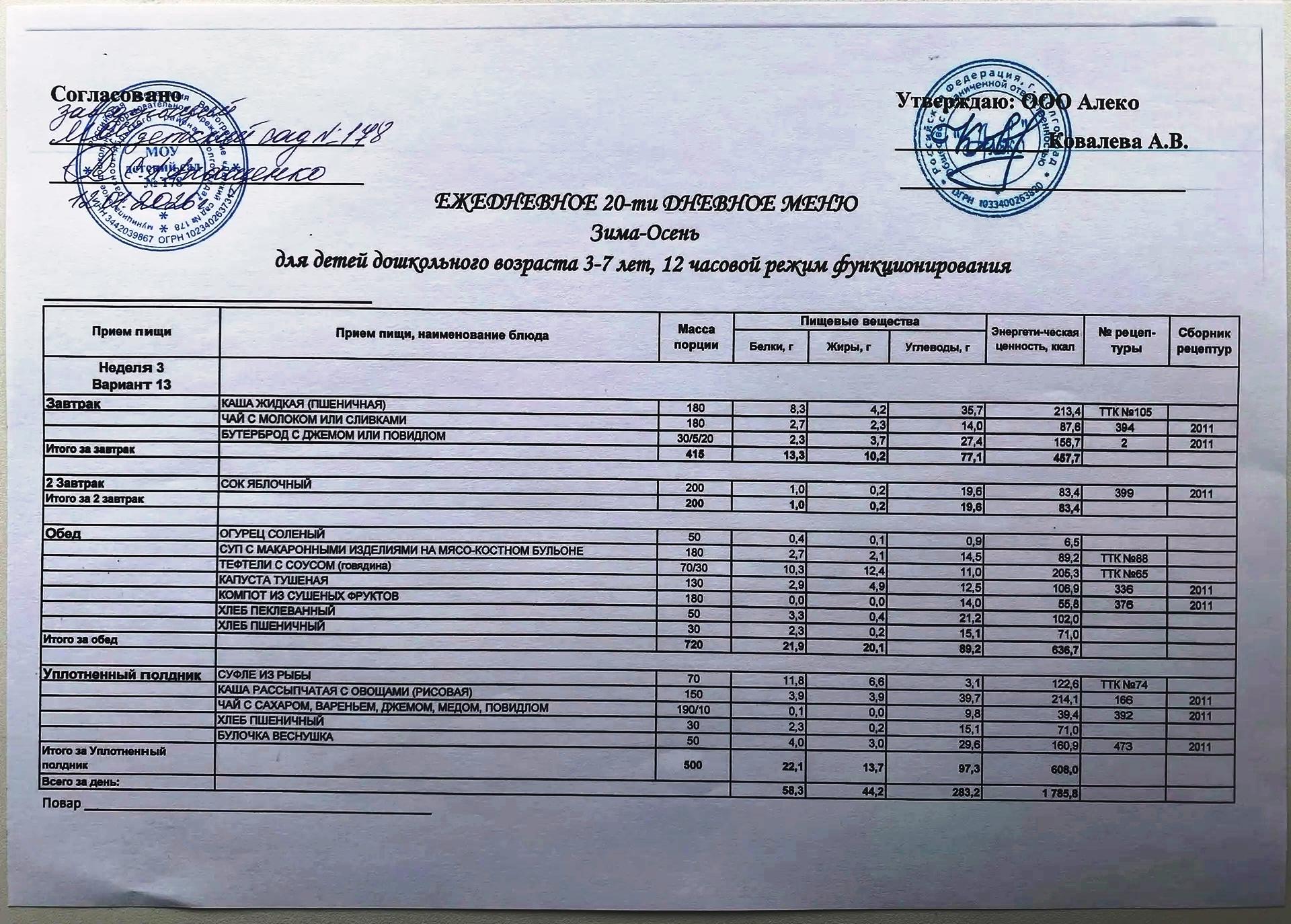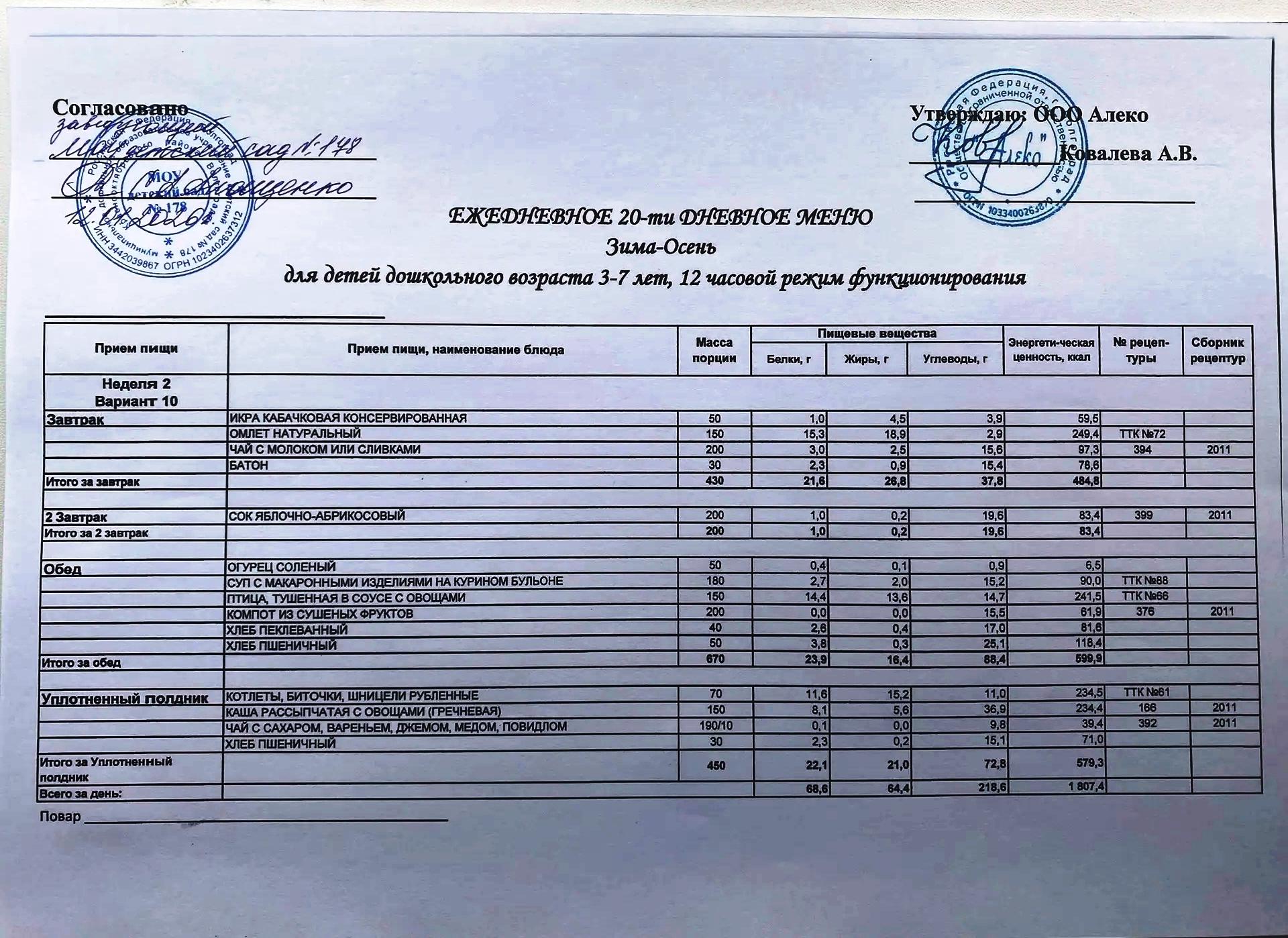 С 12.01.2026 года действует ежедневное 20-ти дневное меню Зима-Осень для детей 3-7 лет дошкольного возраста с 12-ти часовым режимом функционирования