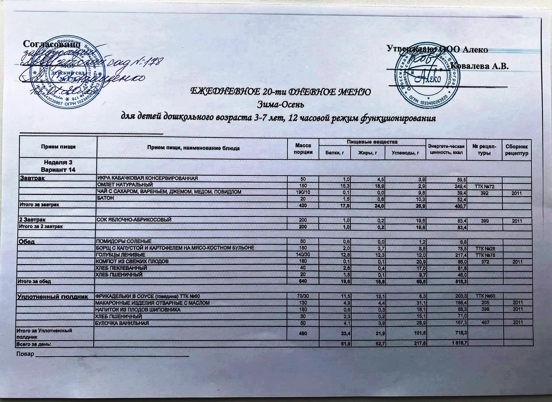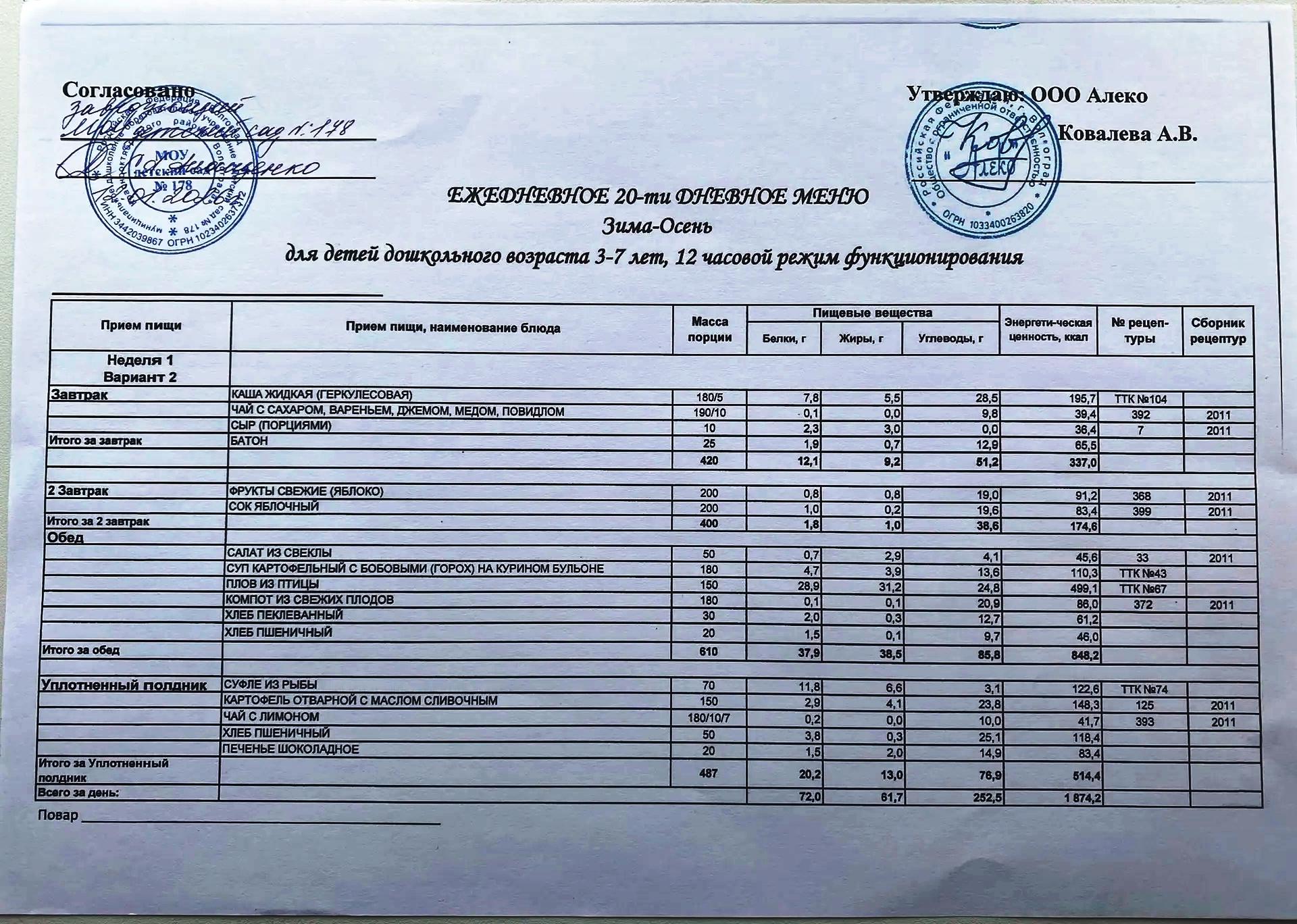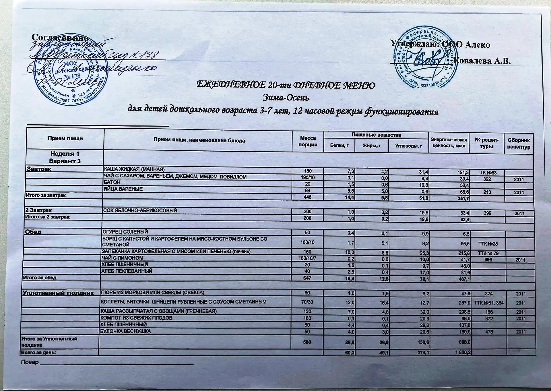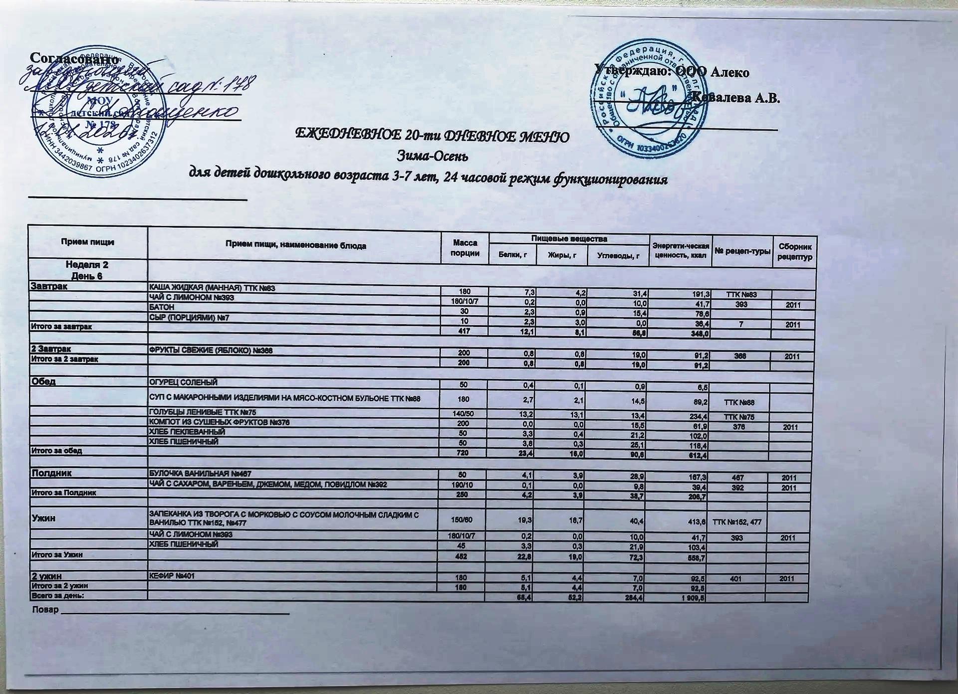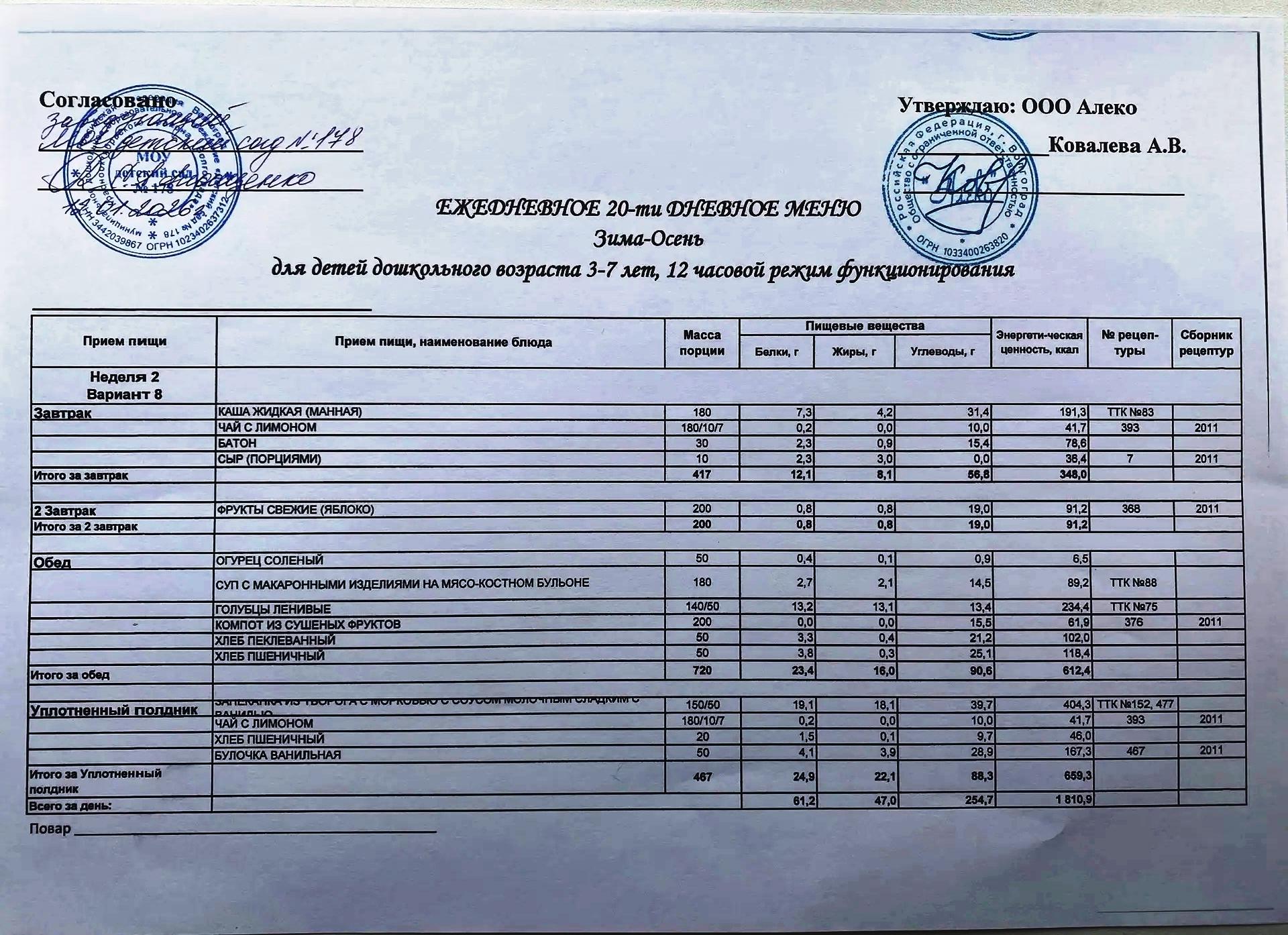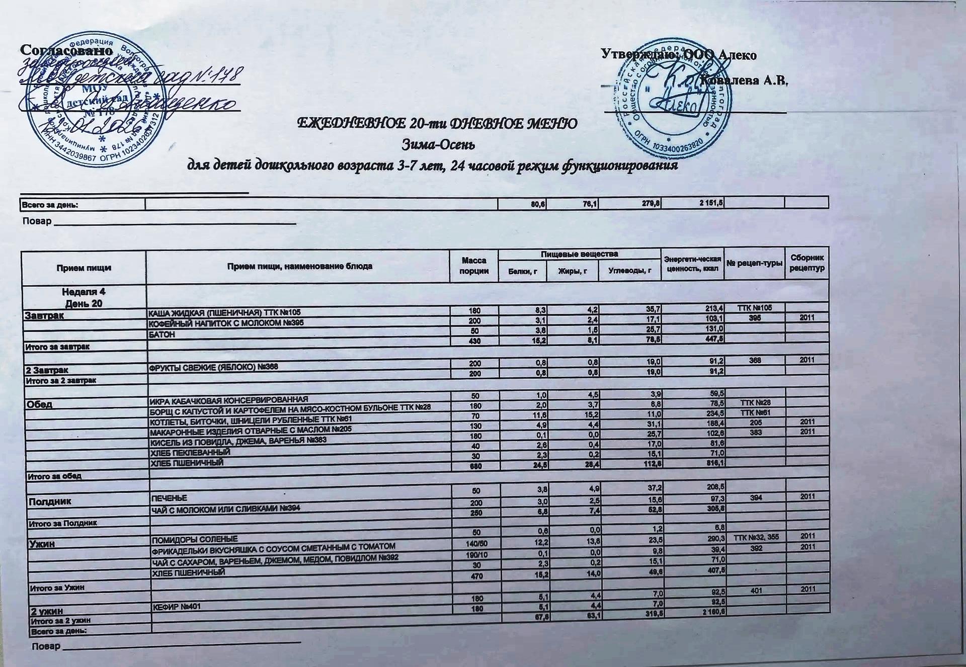 С 12.01.2026 года действует ежедневное 20-ти дневное меню Зима-Осень для детей 3-7 лет дошкольного возраста с 12-ти часовым режимом функционирования