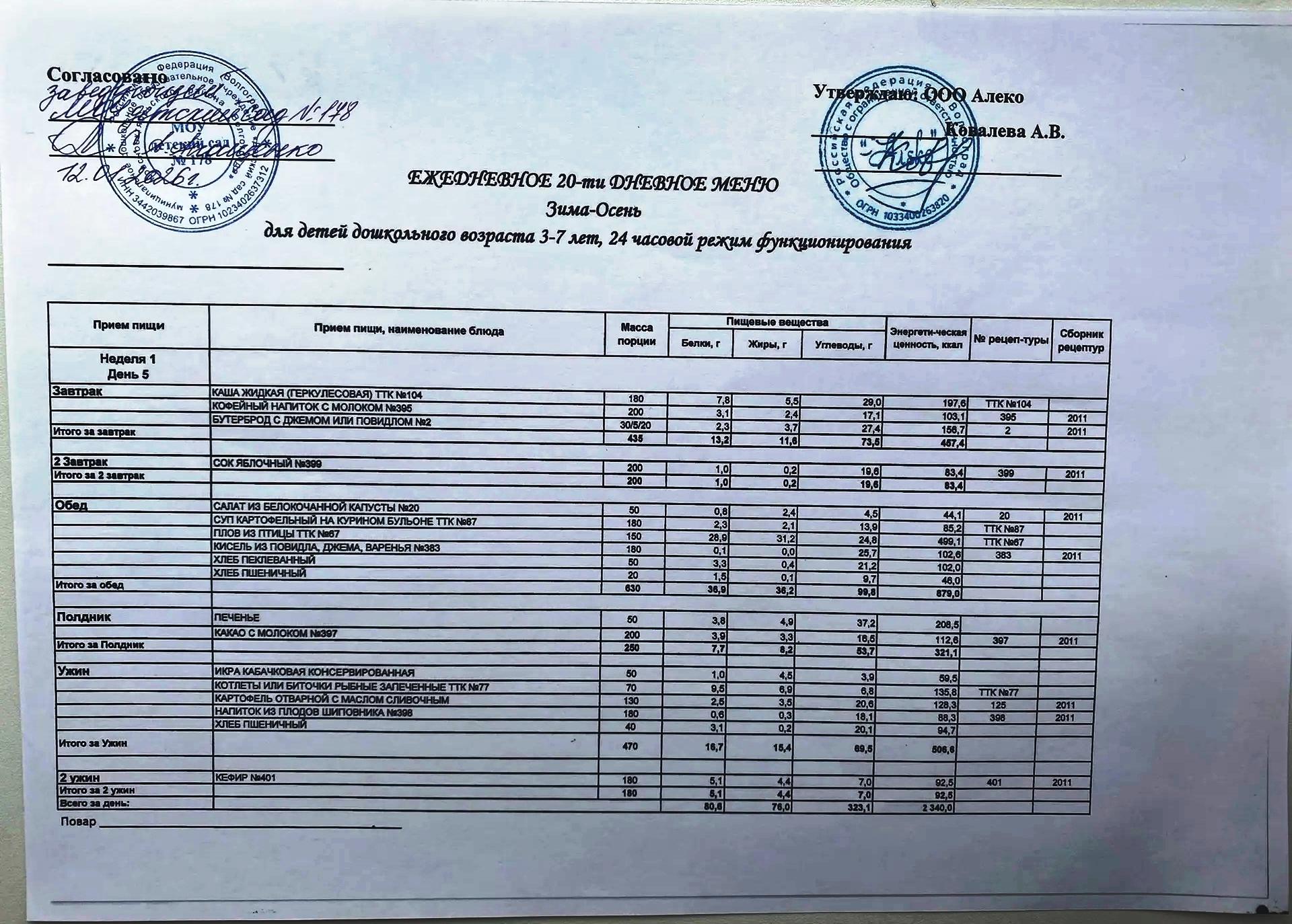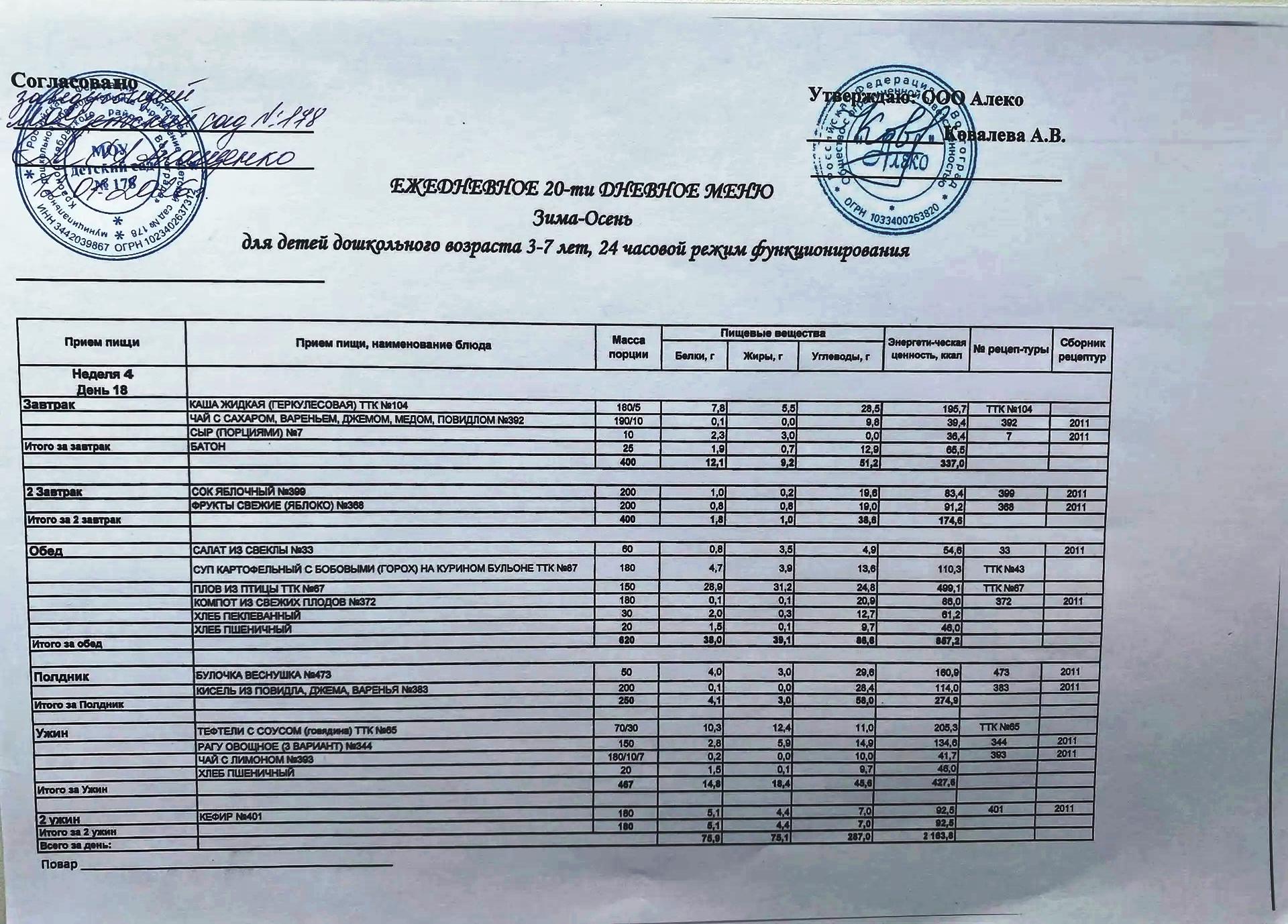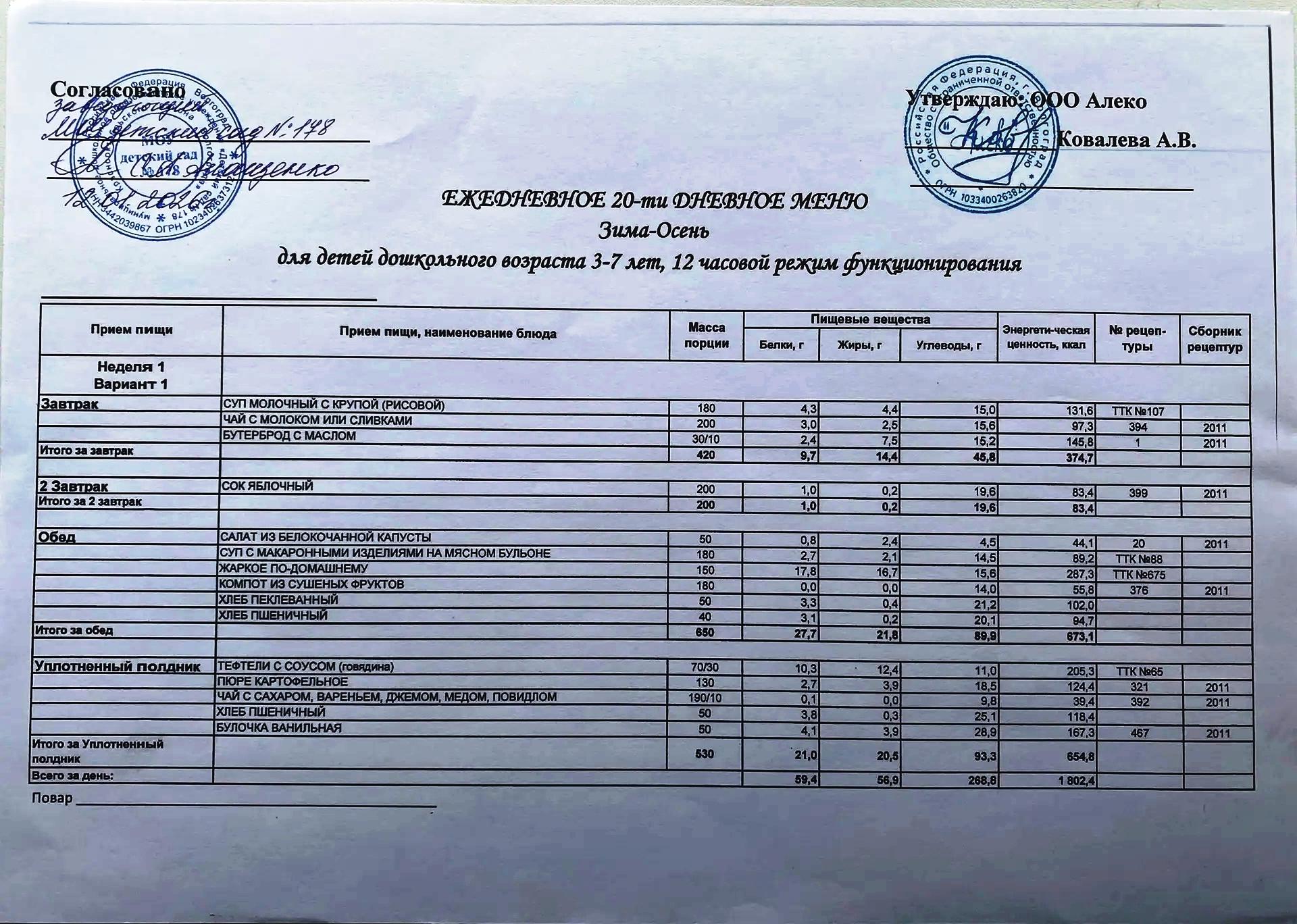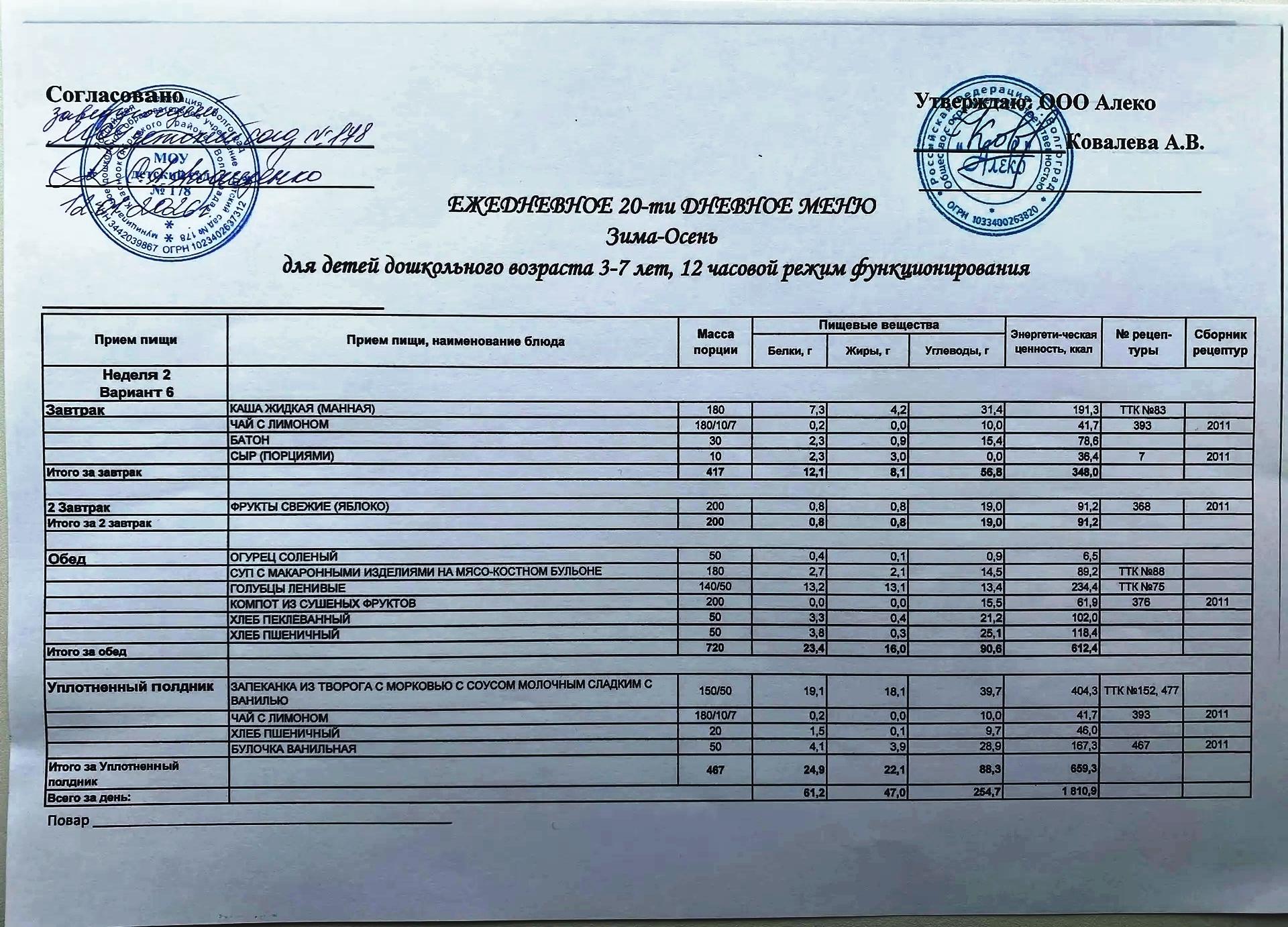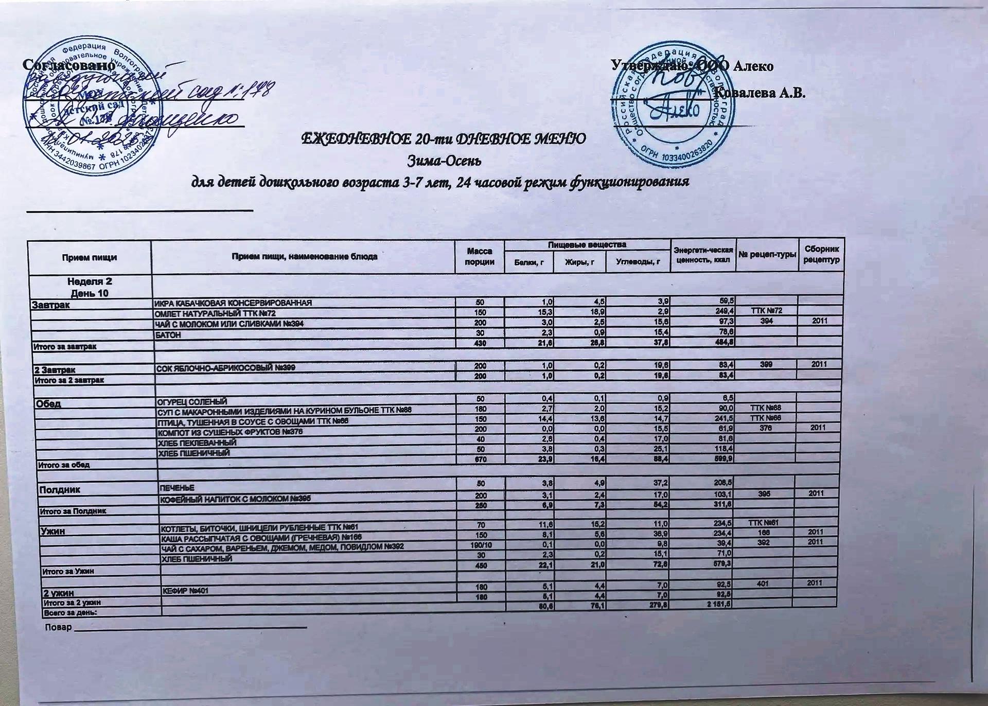 С 12.01.2026 года действует ежедневное 20-ти дневное меню Зима-Осень для детей 3-7 лет дошкольного возраста с 12-ти часовым режимом функционирования
