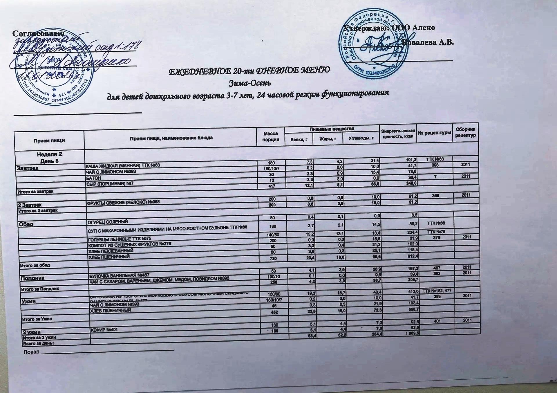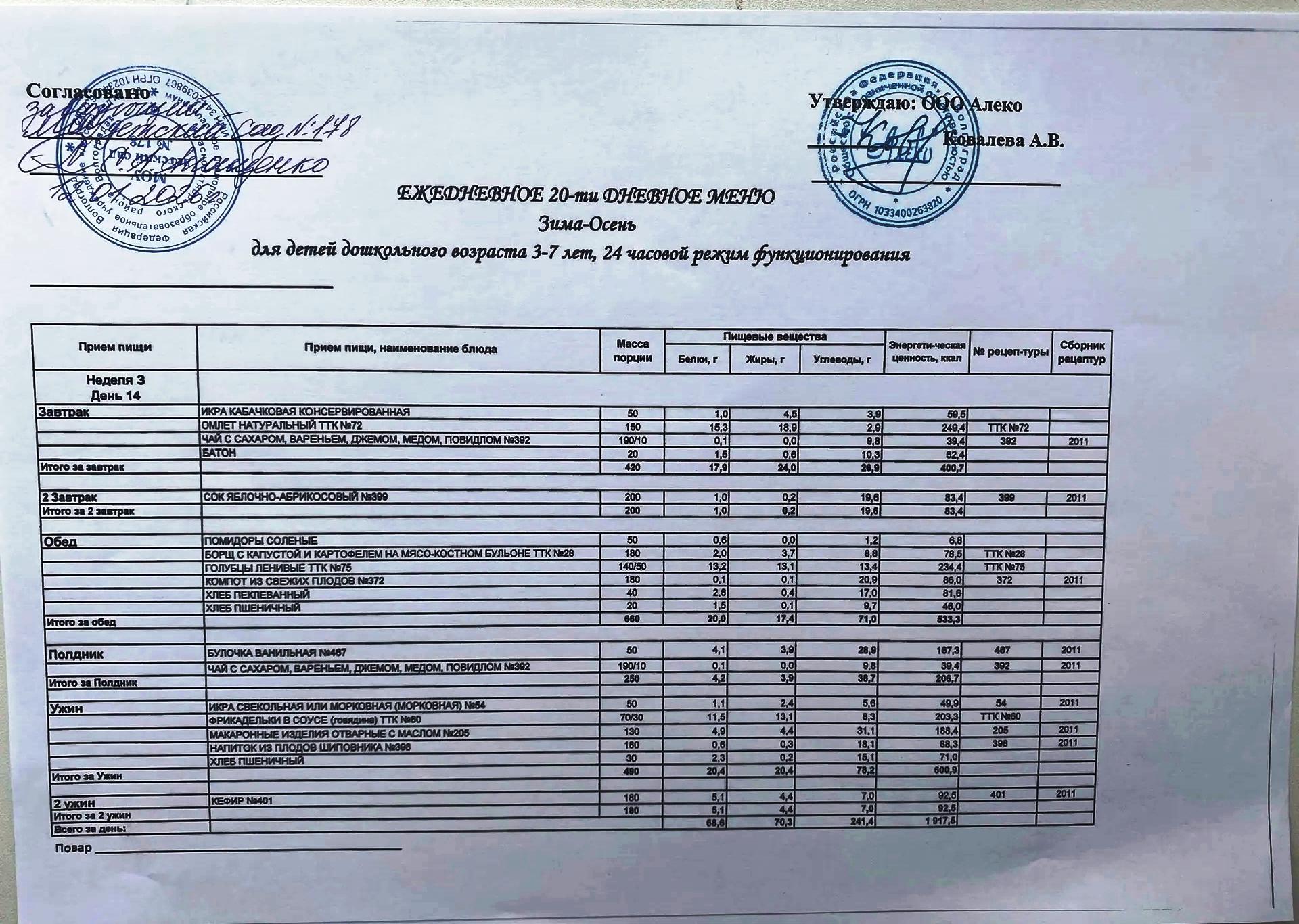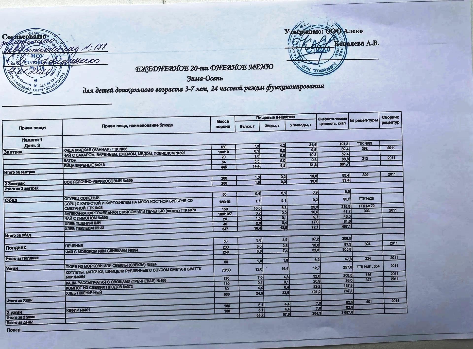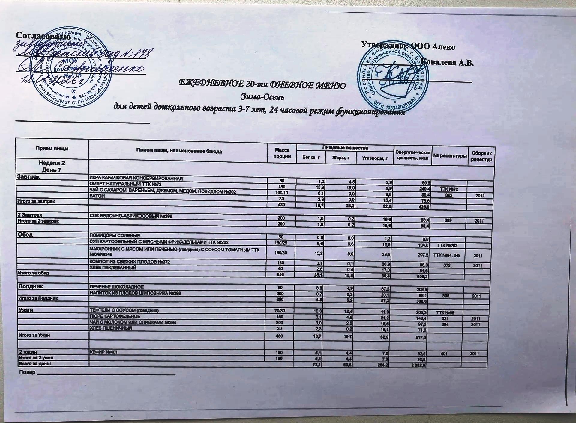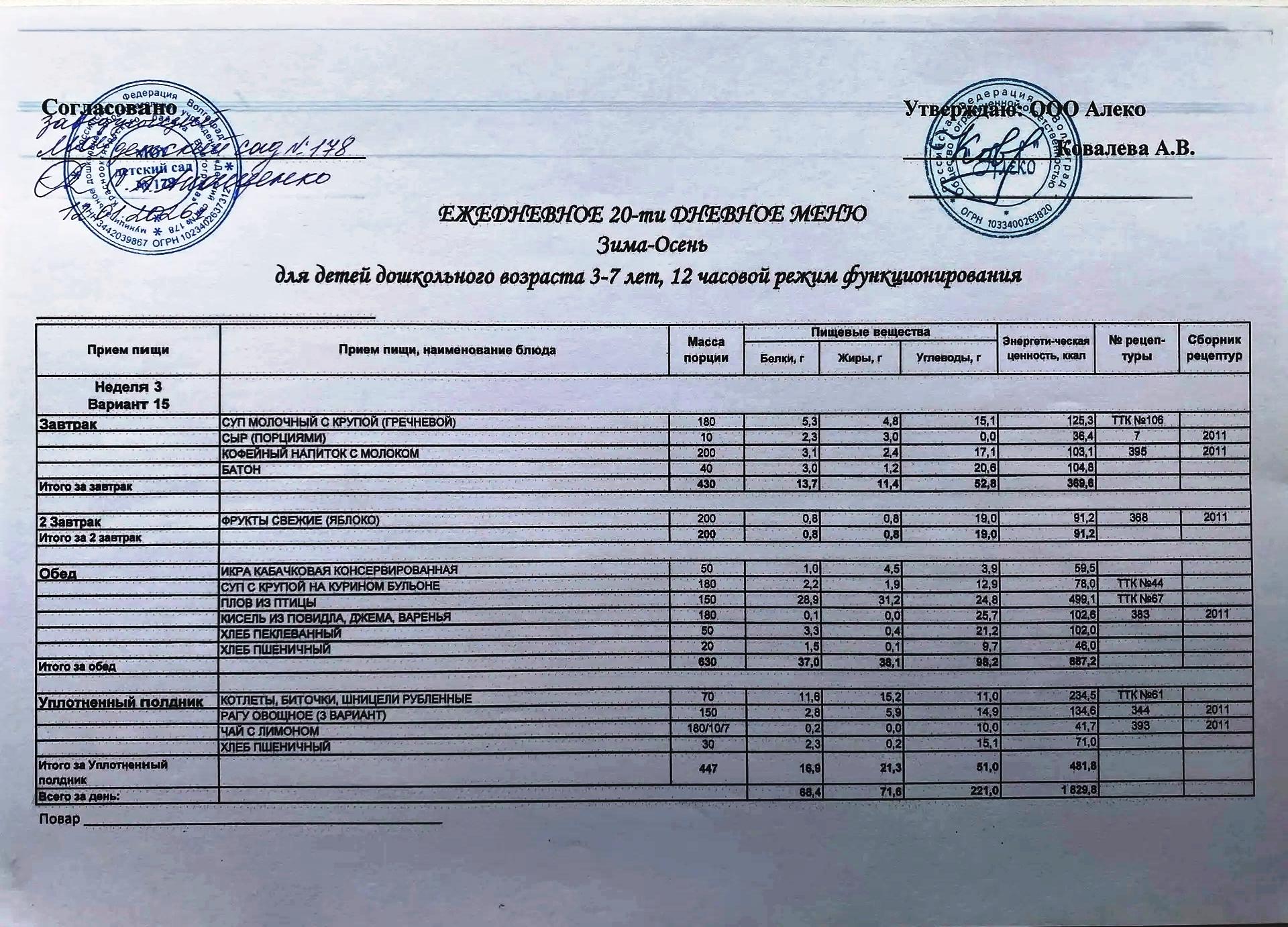 С 12.01.2026 года действует ежедневное 20-ти дневное меню Зима-Осень для детей 3-7 лет дошкольного возраста с 12-ти часовым режимом функционирования
