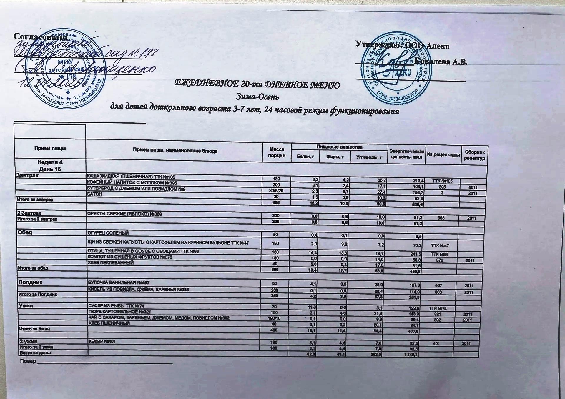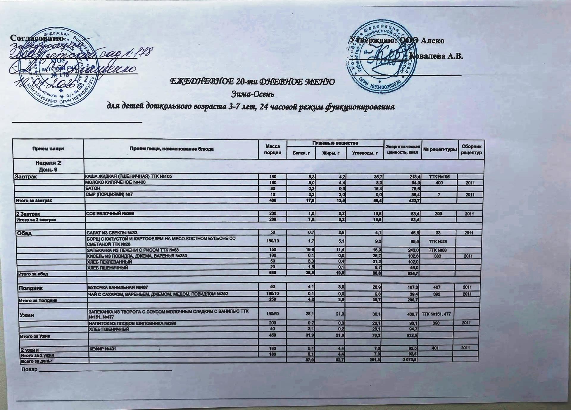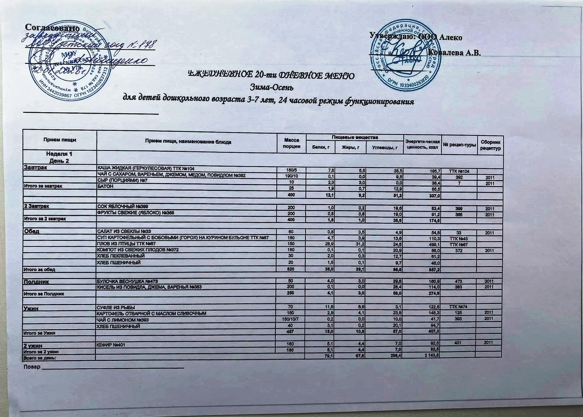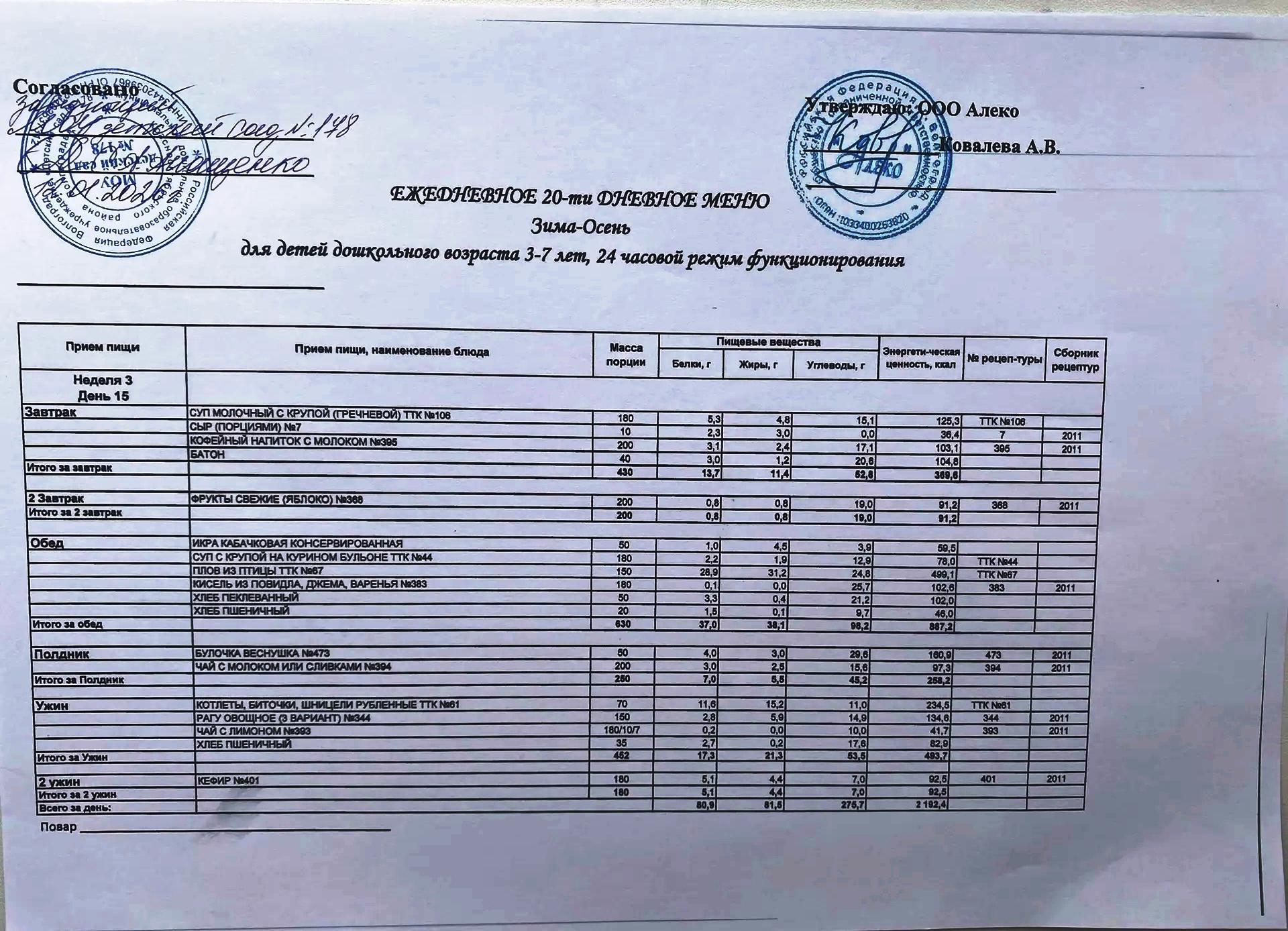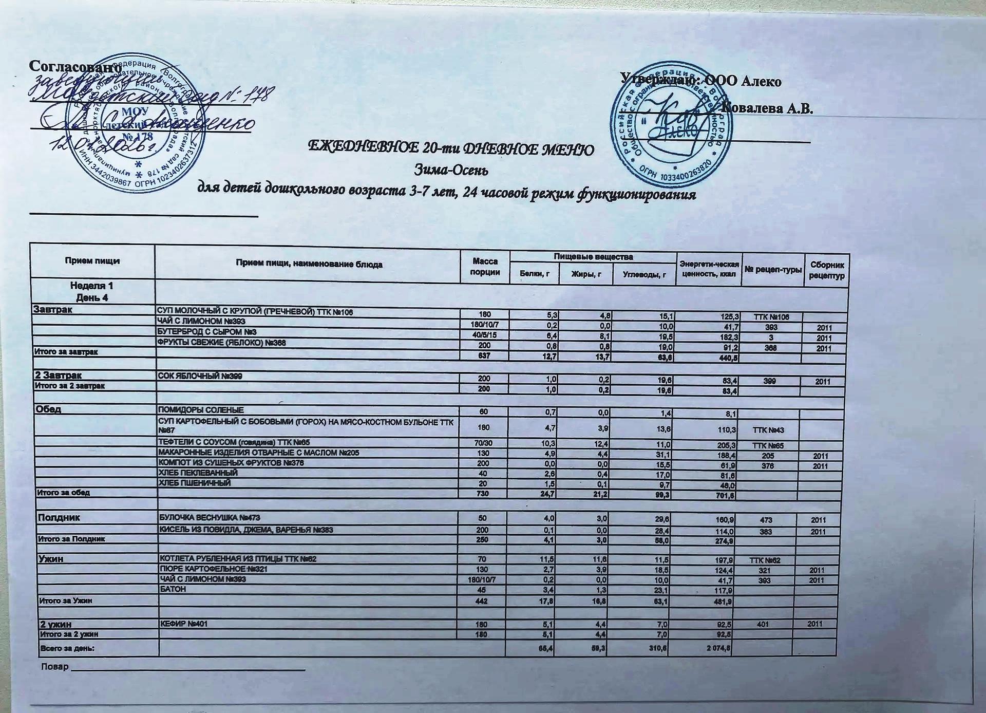 С 12.01.2026 года действует ежедневное 20-ти дневное меню Зима-Осень для детей 3-7 лет дошкольного возраста с 12-ти часовым режимом функционирования